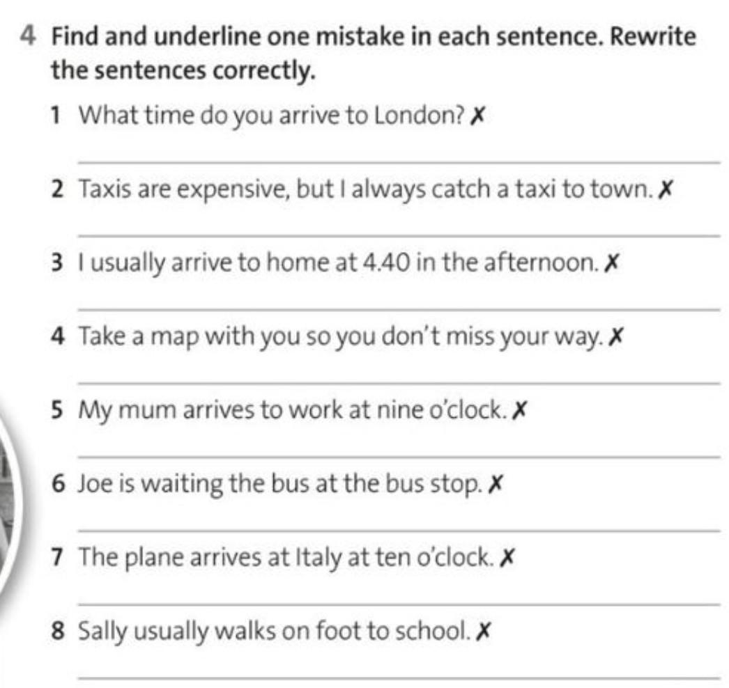 5. My mum arrives **to** work at nine o'clock. (Correction: My mum arrives **at** work at nine o'clock.)