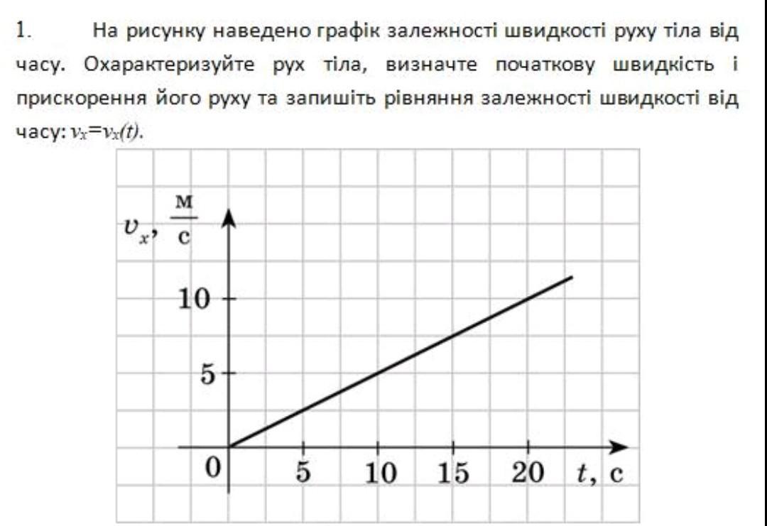 На рисунку наведено графік залежності швидкості руху тіла від часу. Охарактеризуйте рух тіла, визначте початкову швидкість прискорення його руху та запишіть рiвняння залежності швидкості від часу:Vx=Vx(t).