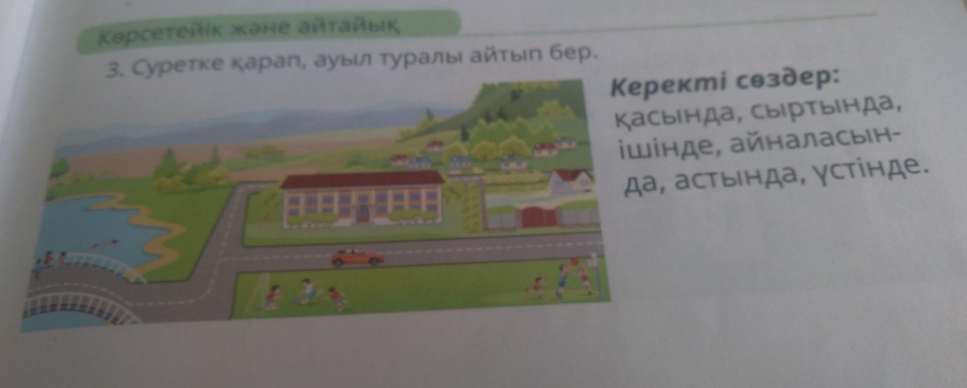 Ауыл қасында үлкен таулар бар, мектептің сыртында балалар ойнап жүреді, мектептің ішінде әдемі және өте кең, көпірдің астында өзен бар, ал үстінде адамдар мен көліктер өтеді