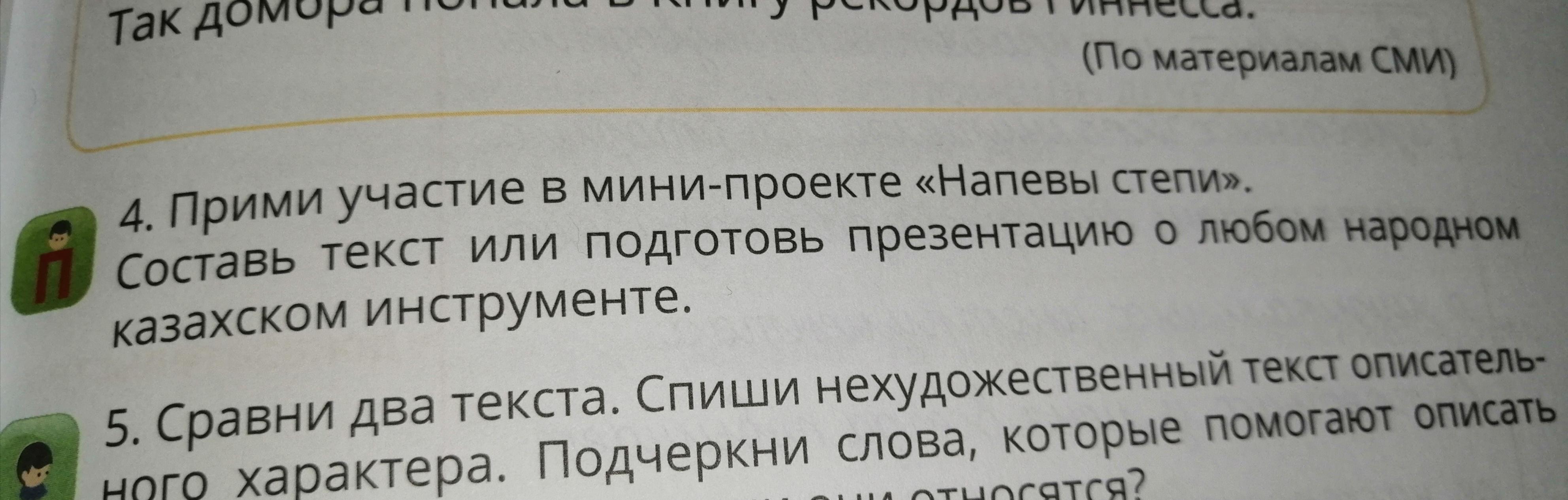 4. Прими участие в мини-проекте «Напевы степи». Составь текст или подготовь презентацию о любом народном казахском инструменте.