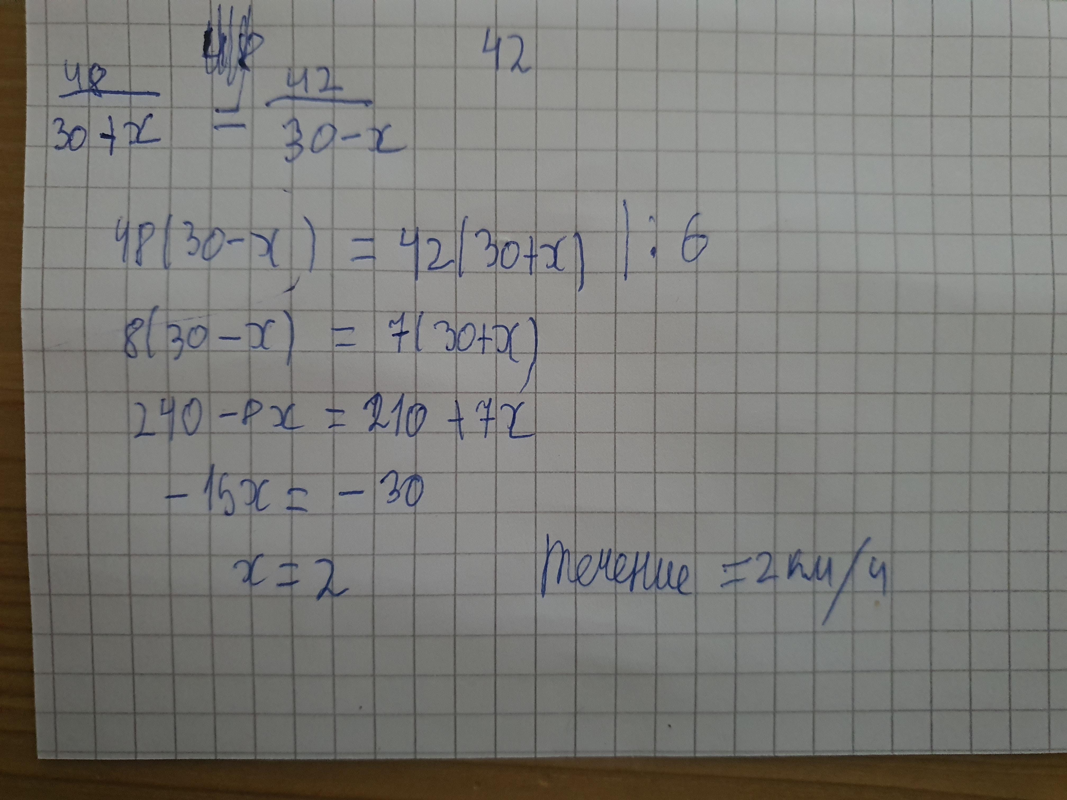 Моторний човен, власна швидкість якого дорівнює 30 км/год, пройшов за течією ріки відстань 48 км та проти течії ріки - 42 км. Яка швидкість течії ріки, якщо відомо, що на шлях за течією човен витратив стільки ж часу, скільки й на шлях проти течії?