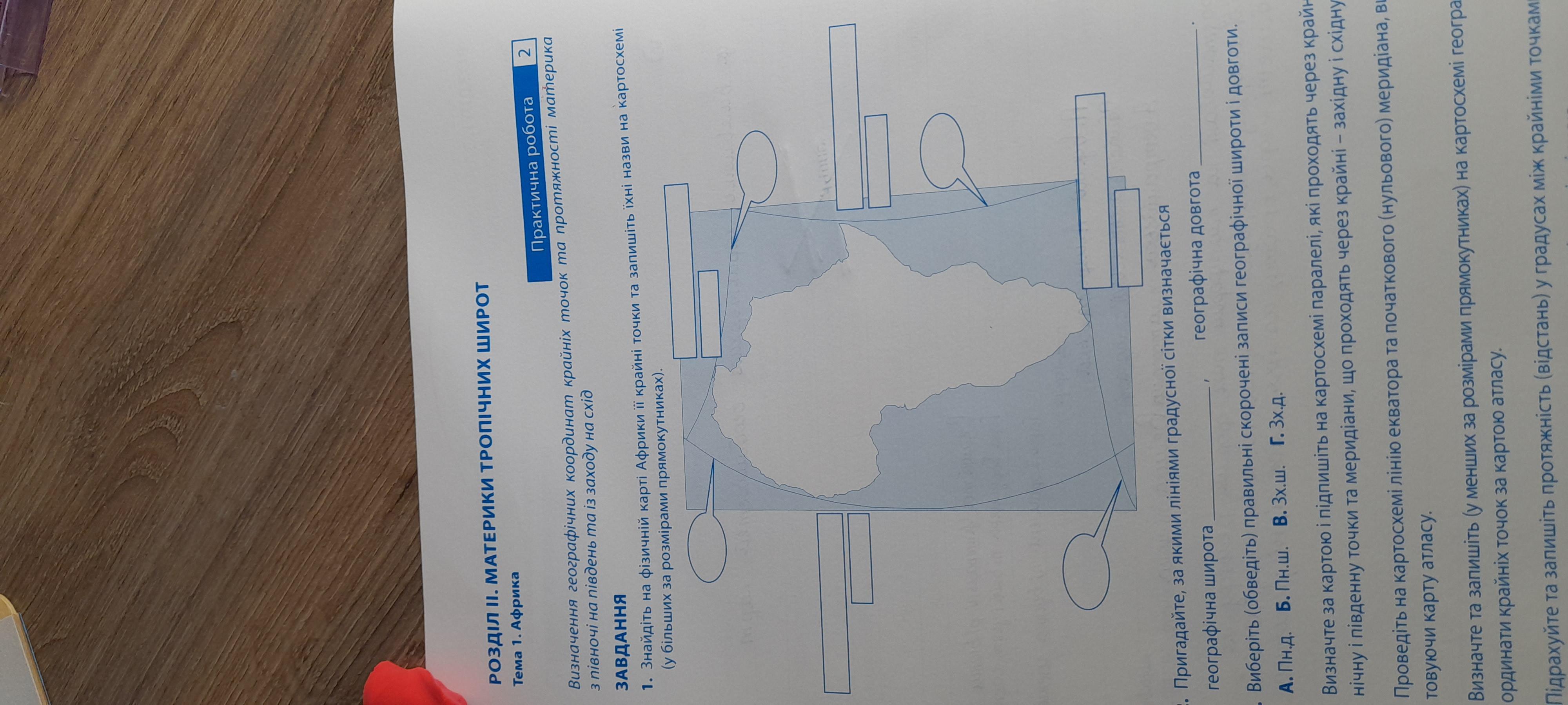 Знайдіть на фізичній карті Африки її крайні точки та запишіть їх назви на картосхемі ( у більших за розмірами прямокутниках). Допоможіть пж