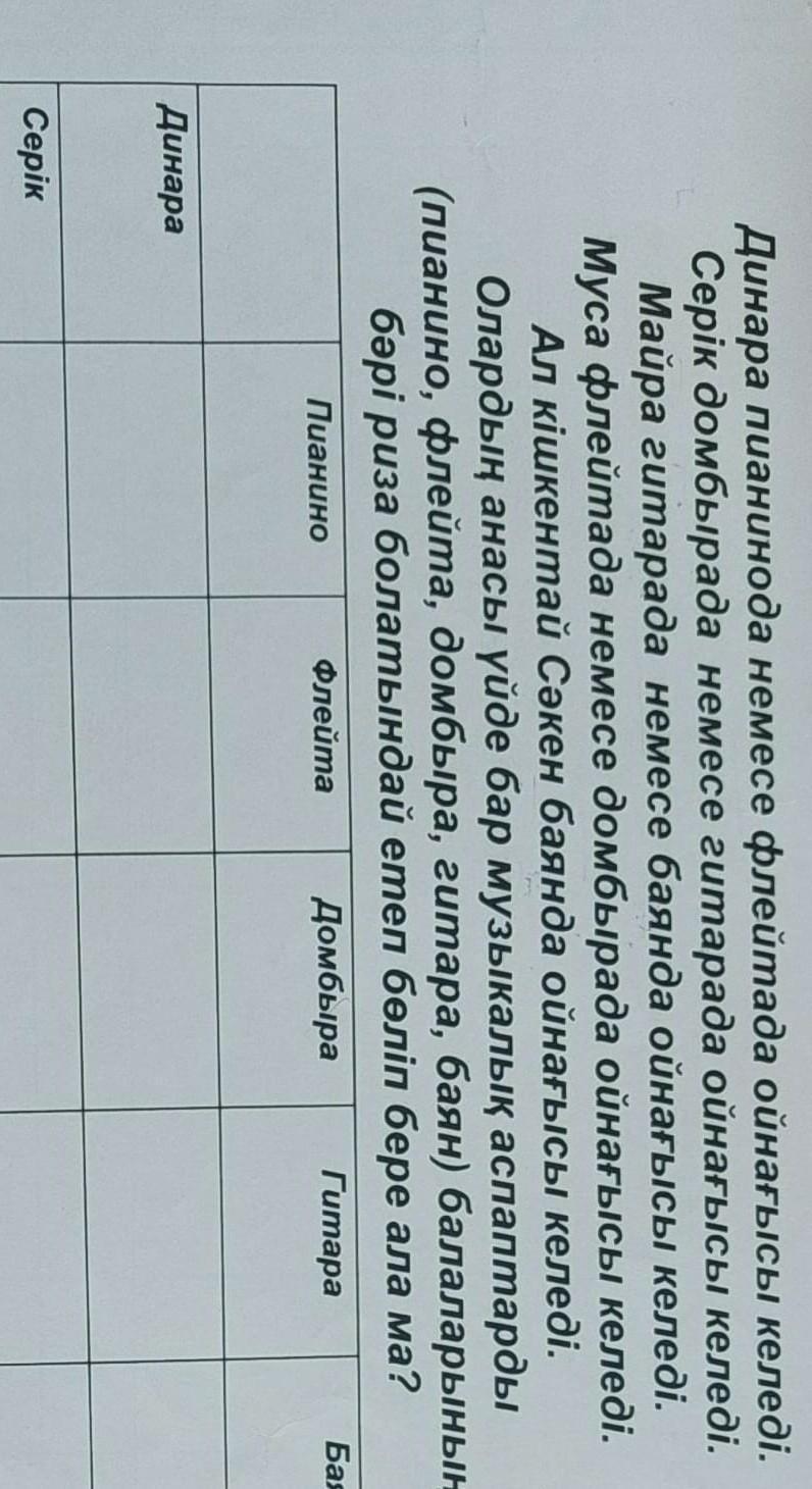 Динара пианинода немесе флейтада ойнағысы келеді. Серік домбырада немесе гитарада ойнағысы келеді. Майра гитарада немесе баянда ойнағысы келеді. Муса флейтада немесе домбырада ойнағысы келеді. Ал кішкентай Сәкен баянда ойнағысы келеді. Олардың анасы үйде бар музыкалық аспаптарды (пианино, флейта, домбыра, гитара, баян) балаларының бәрі риза болатындай етеп бөліп бере ала ма? Пианино Флейта Домбыра Гитара Динара Серік Баян