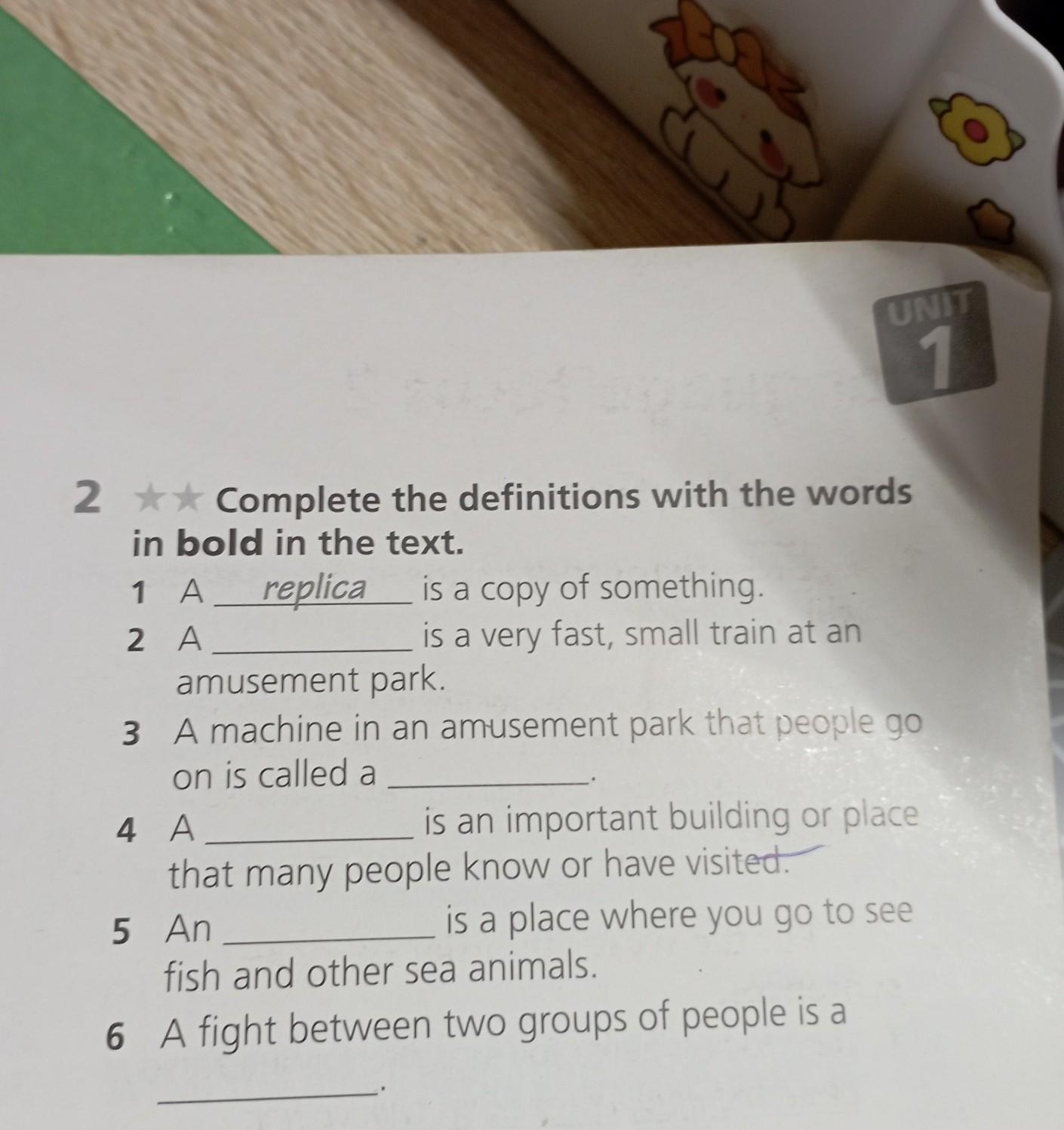 2 ★★ Complete the definitions with the words in bold in the text. 1 A replica 2 A is a copy of something. is a very fast, small train at an amusement park. 3 A machine in an amusement park that people go on is called a 4 A is an important building or place that many people know or have visited. 5 An is a place where you go to see fish and other sea animals. 6 A fight between two groups of people is a