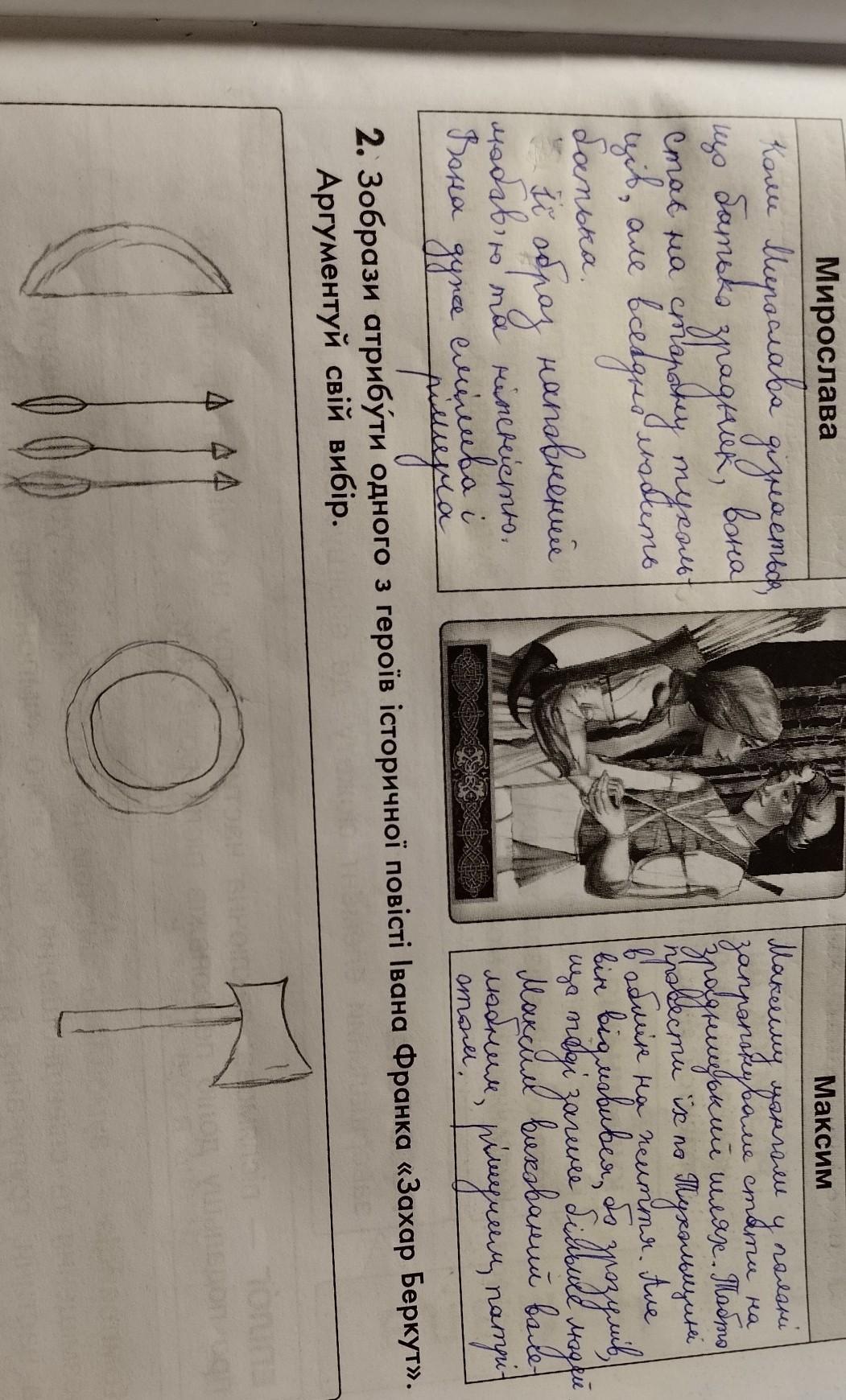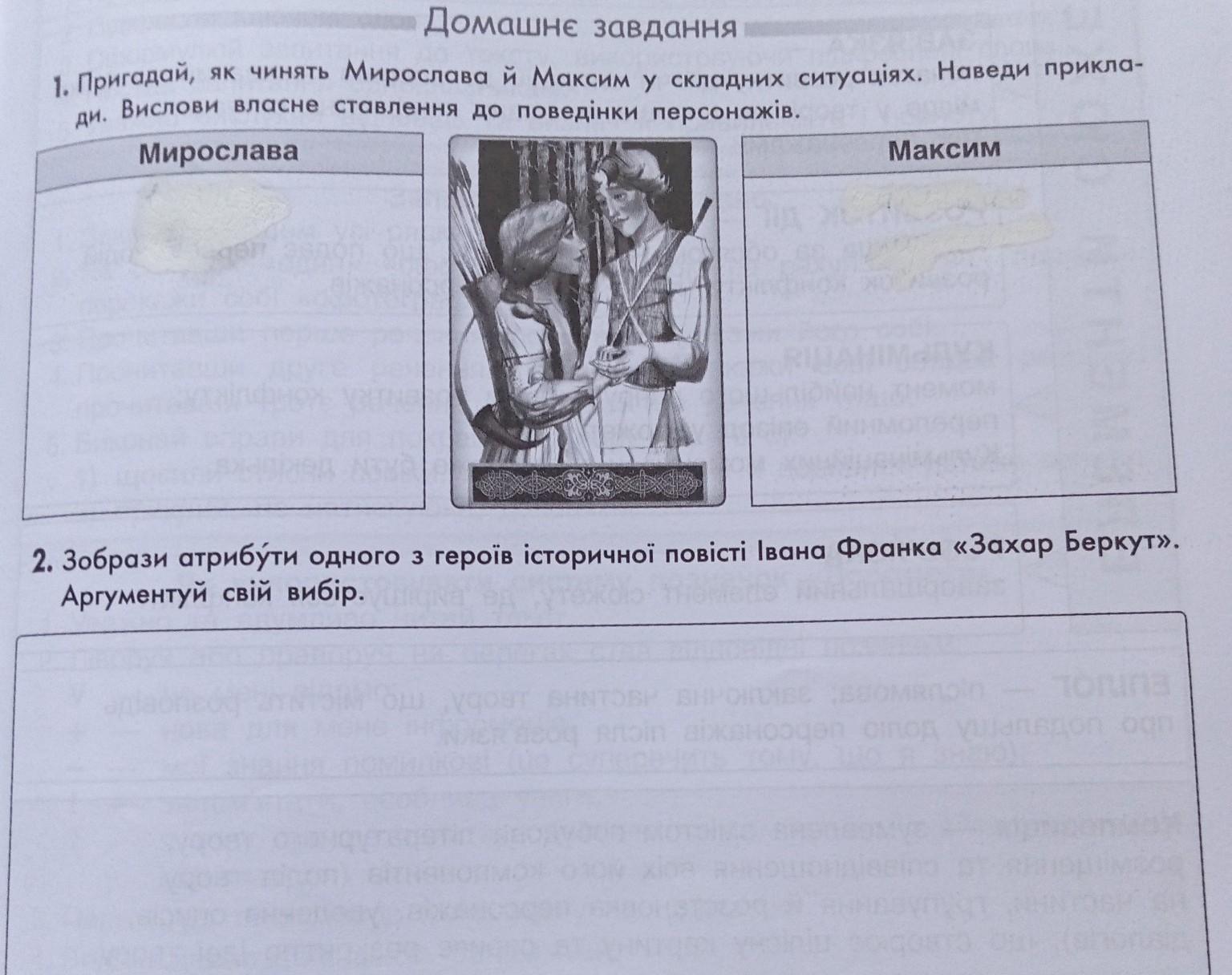 1. Пригадай, як чинять Мирослава й Максим у складних ситуаціях. Наведи прикла- ди. Вислови власне ставлення до поведінки персонажів. Мирослава Максим 2. Зобрази атрибути одного з героїв історичної повісті Івана Франка «Захар Беркут». Аргументуй свій вибір.