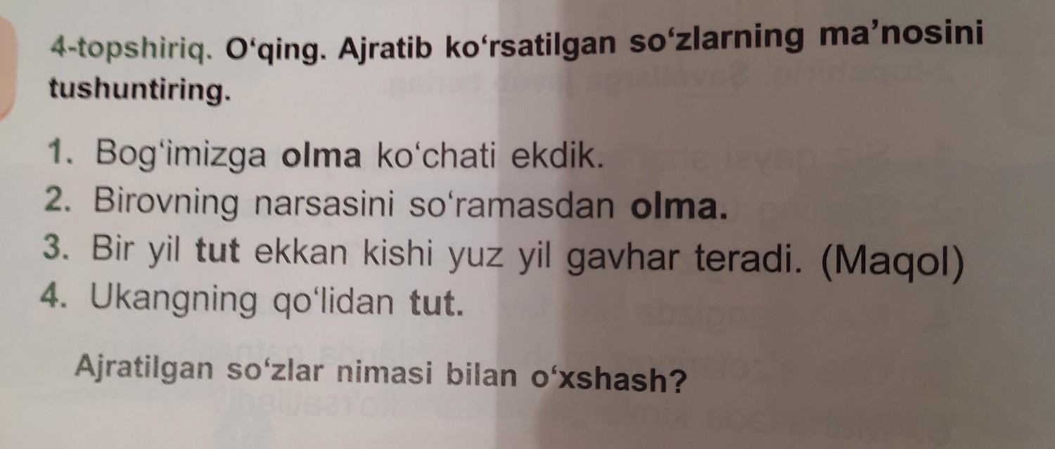 4-topshiriq. O'qing. Ajratib ko'rsatilgan so'zlarning ma'nosini tushuntiring. 1. Bog'imizga olma ko'chati ekdik. 2. Birovning narsasini so'ramasdan olma. 3. Bir yil tut ekkan kishi yuz yil gavhar teradi. (Maqol) 4. Ukangning qo'lidan tut. Ajratilgan so'zlar nimasi bilan o'xshash?