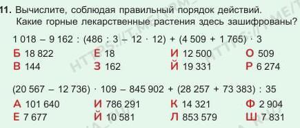 1. Вычислите, соблюдая правильный порядок действий. Какие горные лекарственные растения 1018 - 9 162: (4863 12 12) + (4 509 + 1765) 3 Б 18 822 в 144 HT A 101 640 E 7 677 E 18 3 162 и 12 ху, ашифрованы? и 12 500 й 19 331 (20 567 12 736) 109 845 902 + (28 257 + 73 383): 35 ф 2 904 ш 7 831 и 786 291 Й 10 581 O 509 P 6 274 к 14 321 Л 853 579