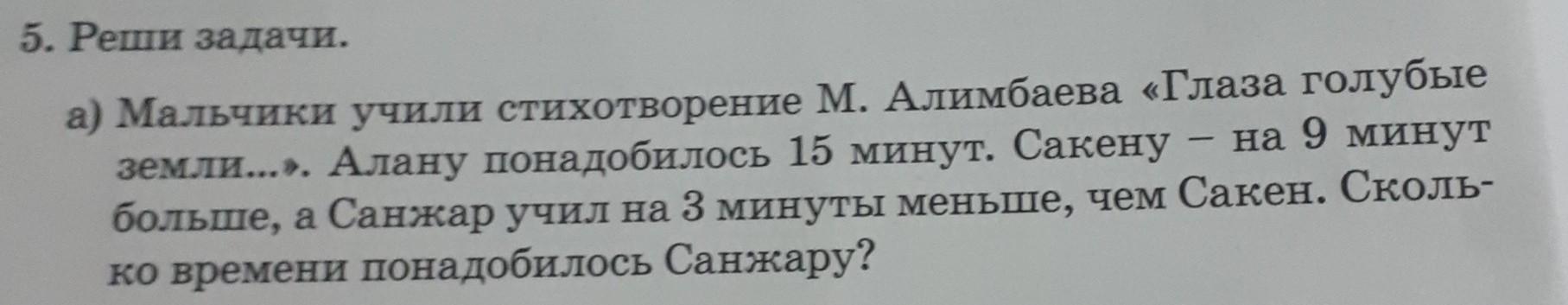 5. Реши задачи. - а) Мальчики учили стихотворение М. Алимбаева «Глаза голубые - на 9 минут земли..... Алану понадобилось 15 минут. Сакену больше, а Санжар учил на 3 минуты меньше, чем Сакен. Сколь- ко времени понадобилось Санжару?