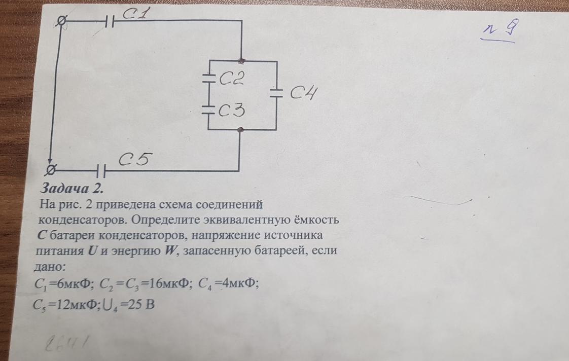 На рис. 2 приведена схема соединений конденсаторов. Определите эквивалентную ёмкость С батареи конденсаторов, напряжение источника питания U и энергию W, запасенную батареей, если дано:
