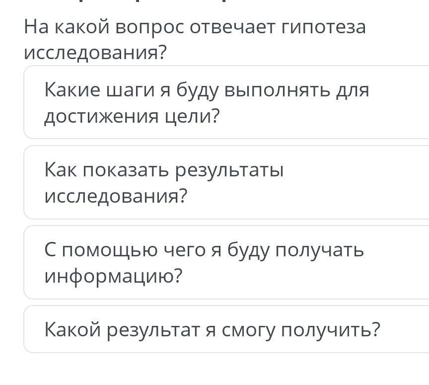 На какой вопрос отвечает гипотеза исследования? Какие шаги я буду выполнять для достижения цели? Как показать результаты исследования? С помощью чего я буду получать информацию? Какой результат я смогу получить?