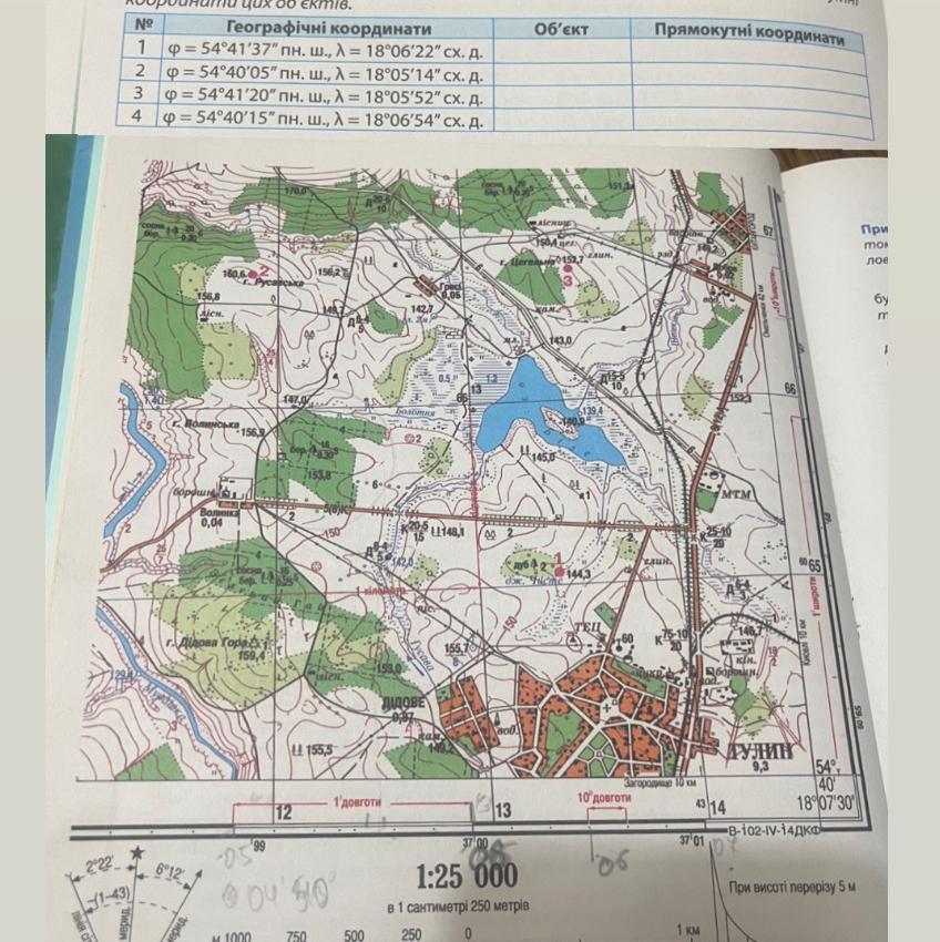 Срочно ! Використовуючи фрагмент топографічної карти (див. мал. 5), визначте, які об'ск. ти розташовані за наведеними географічними координатами. Запишіть прямокутні координати цих об'єктів.