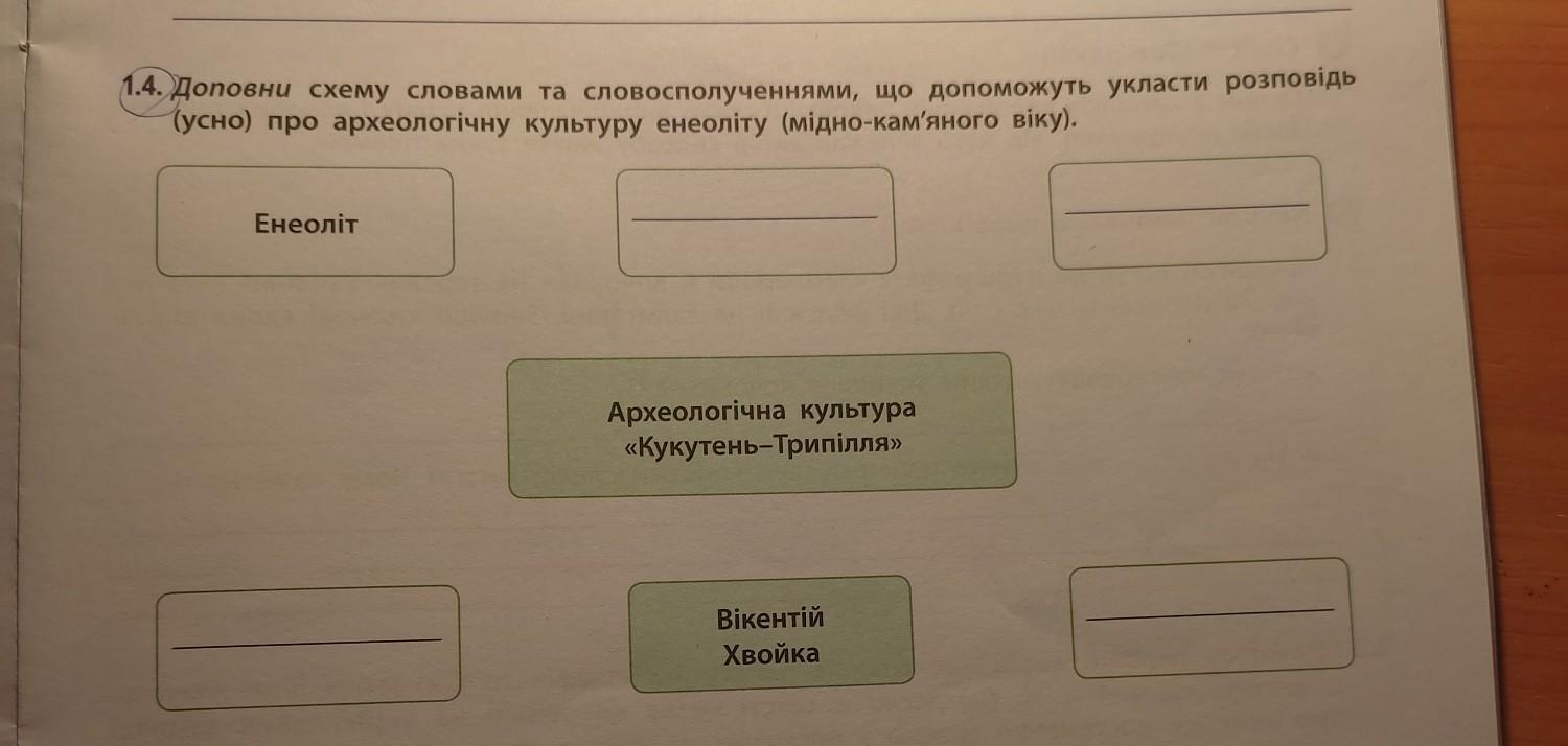 1.4. Доповни схему словами та словосполученнями, що допоможуть укласти розповідь (усно) про археологічну культуру енеоліту (мідно-кам'яного віку). Енеоліт Археологічна культура «Кукутень-Трипілля» Вікентій Хвойка. ПЖжжжж срочнно надо!!!! дам 40 баллов!!!