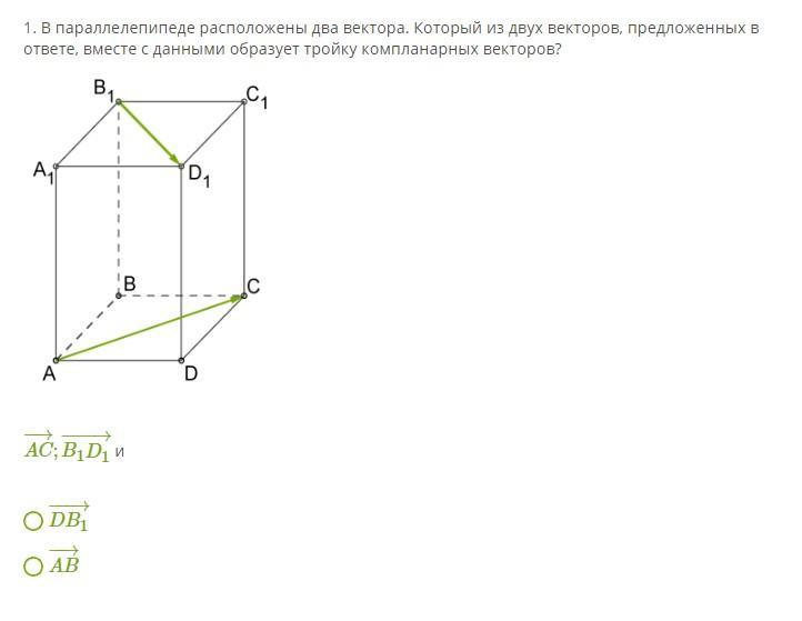 1. В параллелепипеде расположены два вектора. Который из двух векторов, предложенных в ответе, вместе с данными образует тройку компланарных векторов?