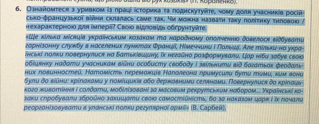 Уривок описує долю українських козаків та народного ополчення під час російсько-французької війни та після її завершення. Доля цих учасників війни склалася саме так через політику Російської імперії.Цар Росії змушував українських козаків та ополчення служити в гарнізонах на території Франції, Німеччини та Польщі. Проте після повернення на Батьківщину їх розформували та не надали особистої свободи, залишивши українців під феодальними повинностями. Водночас, переможці Наполеона примусили бути кріпаками під пануванням поміщиків або державними селянами.Ця політика Російської імперії була нехарактерною для імперії, оскільки суперечила ідеям свободи та незалежності, які пропагувалися українськими козаками під час війни. Ця політика суперечила інтересам українського населення та загострила соціальні проблеми, призводячи до спроби захисту самостійності та перетворення українських козаків в уланські полки регулярної армії.