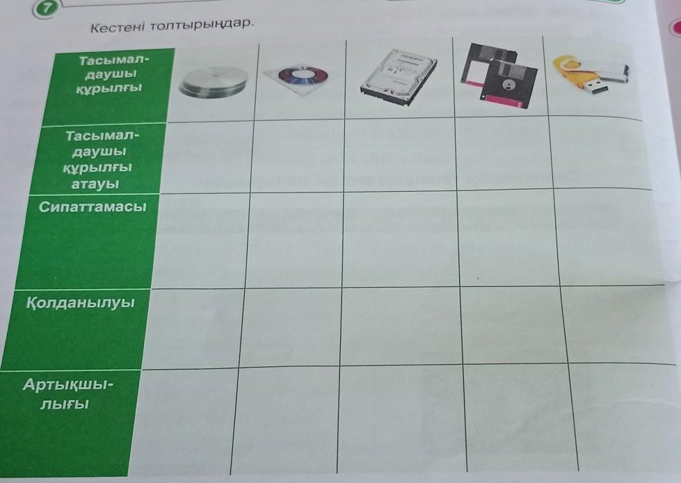 Кестені толтырыңдар. Тасымал- даушы құрылғы Тасымал- даушы құрылғы атауы Сипаттамасы Қолданылуы Артықшы- ЛЫҒЫ