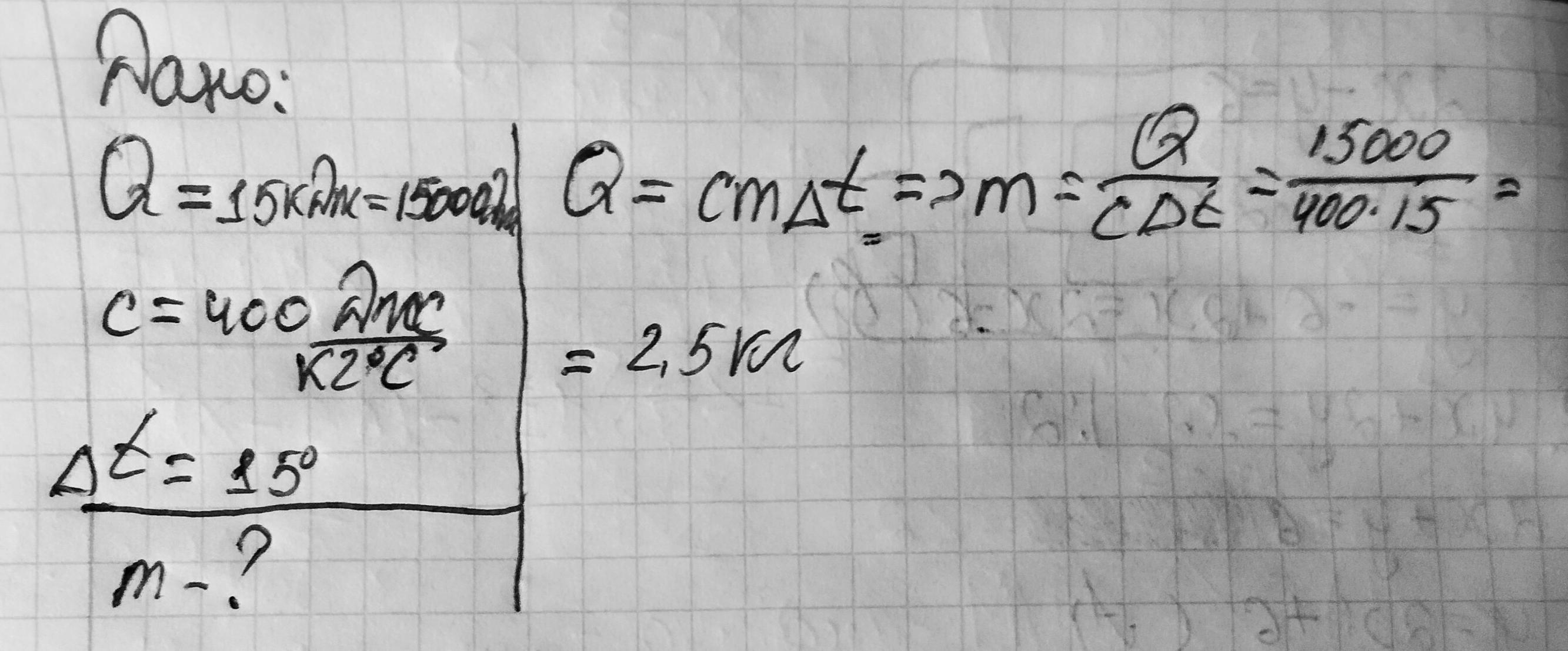 Мідне тіло отримало 15 кДж тепла та нагрілося на 15 С. Визнач масу цього тіла .