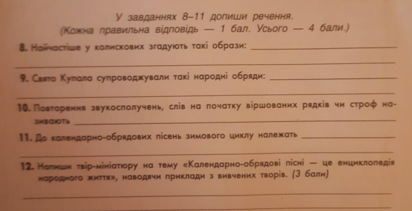 У завданнях 8-11 допиши речення. (Кожна правильна відповідь - 1 бал. Усього - 4 бали.) 8. Найчастіше у колискових згадують такі образи: 9. Свято Купала супроводжували такі народні обряди: 10. Повторення звукосполучень, слiв на початку віршованих рядків чи строф на- зивають 11. До календарно-обрядових пісень зимового циклу належать 12. вiр-мініатюру на тему «Календарно-обрядові пісні - це енциклопедія народного життя, наводячи приклади з вивчених творів. (3 бали)СРОЧНО!!!!ДАЮ 30 БАЛІВ!!!