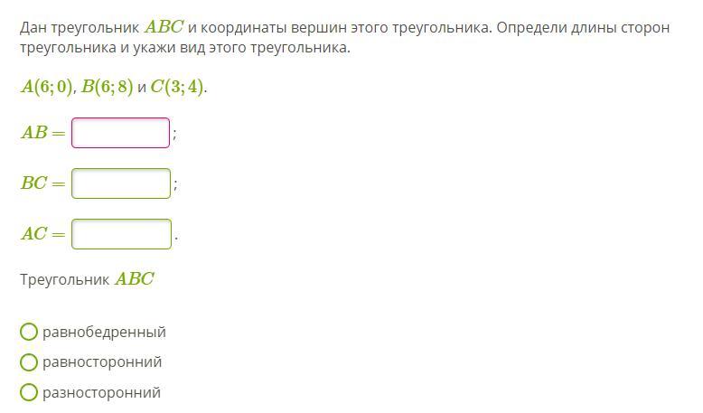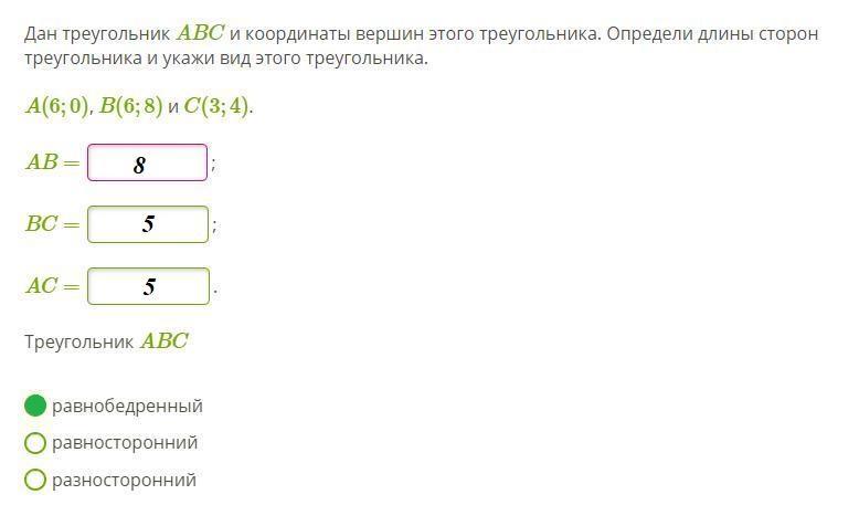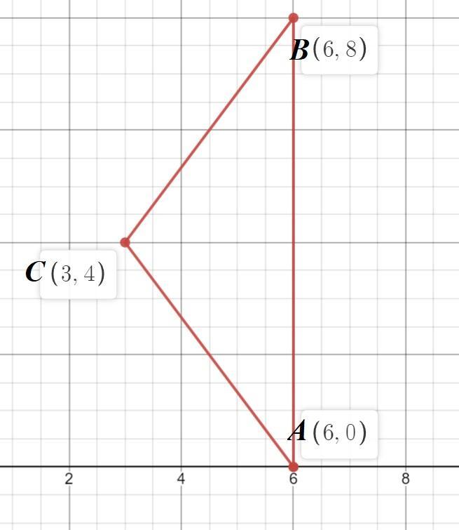 АС²=(xC-xA)² + (yC-yA)² = (3-6)²+(4-0)² = (-3)² + (4)² = 9+16=25;