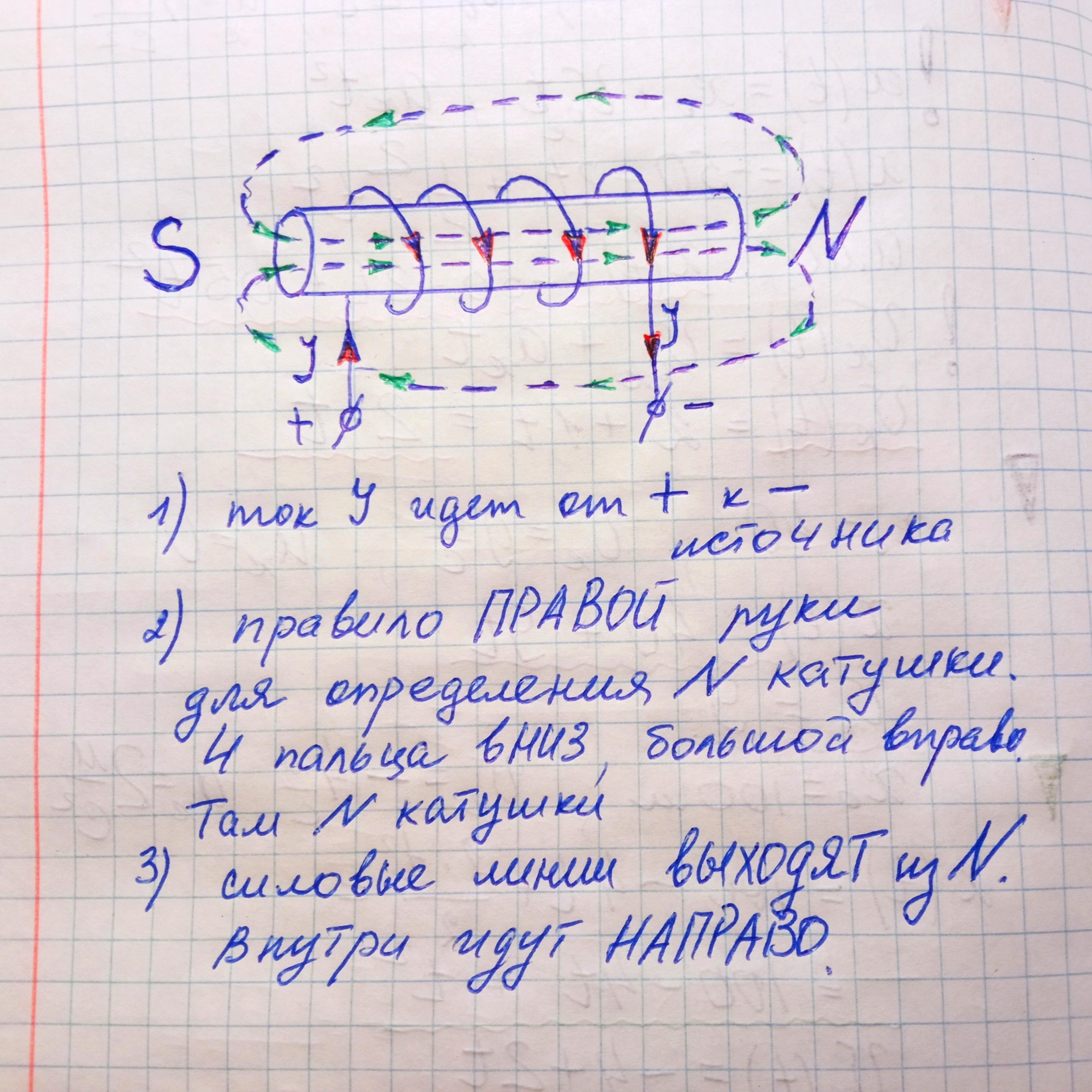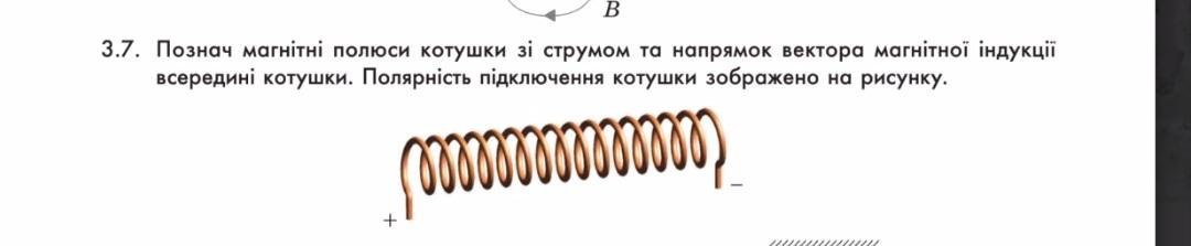 Познач магнітні полюси котушки зі струмом та напрямок вектора магнітної індукції всередені котушки.Полярність підключення котушки зображено на рисунку.