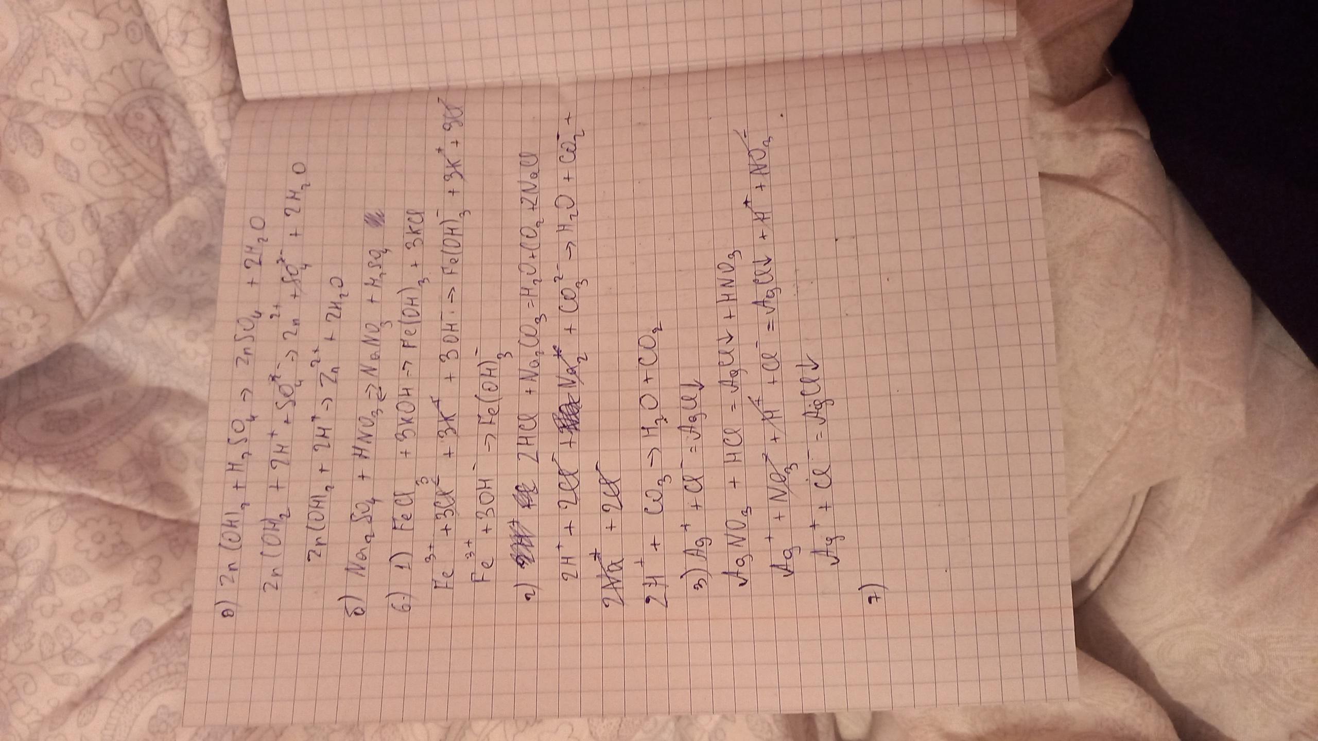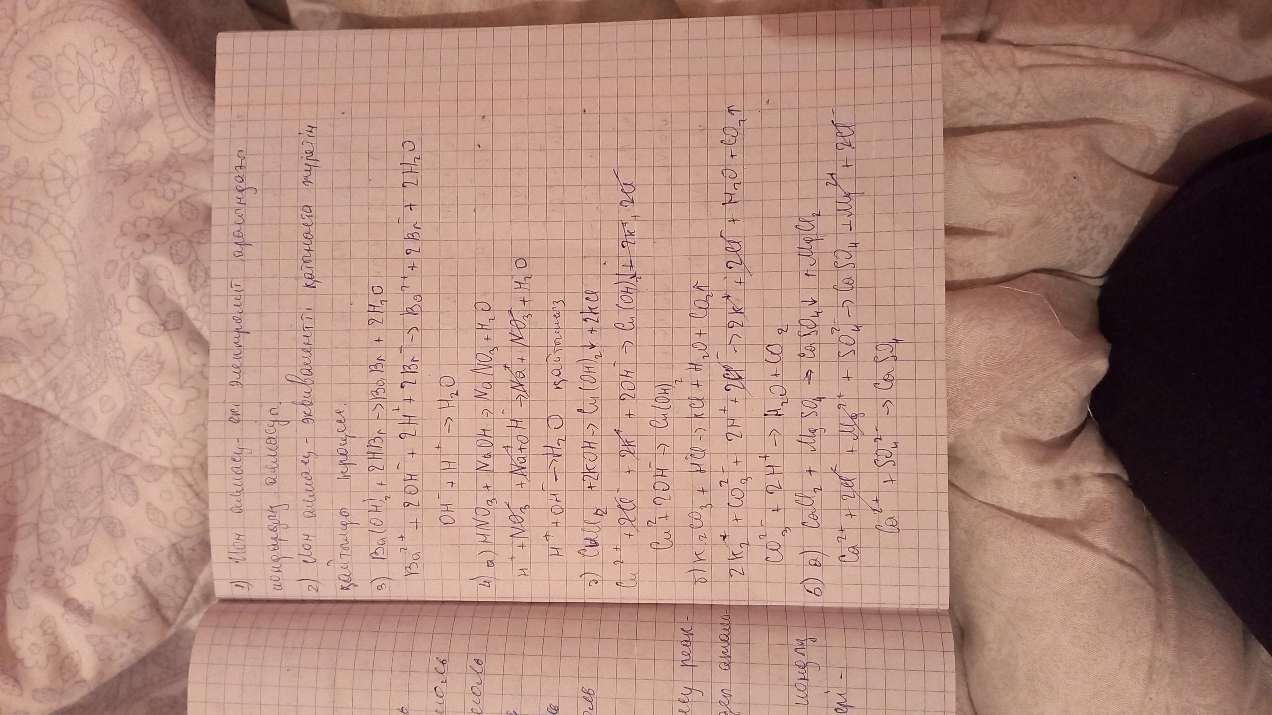 1. Ион алмасу реакциясы деген не? 2. Алмасу реакциясы қандай жағдайда қайтымды және қайтымсыз болады? Мысалдар келтіріңдер. 3. Қайтымсыз ион алмасу реакцияларын тауып теңестіріңдер және олардың иондық теңдеулерiн құрастырындар: a) NaNO3 + LiCI → LiNO3 + NaCl - ә) Ba(OH), + HBr → BaBr, + H,О 6) AICI + NaOH →AI(OH)₂ + NaCl 4. Берілген заттар арасындағы ион алмасу реакцияларының толық және қысқар- тылған иондық теңдеулерін жазыңдар: a) HNO3 + NaOH → NaNO3 + H2O a) CuCl, + KOH → Cu(OH),\ + KCI 6) K,CO3 + HCl → KCI + CO2↑ + H,о 5. Мына заттар арасында жүретін реакциялардың молекулалық және иондық теңдеулерiн жазыңдар: а) кальций хлориді және магний сульфаты; ә) мырыш гидроксиді және күкірт қышқылы; б) натрий сульфаты және азот қышқылы. 6. Қысқартылған иондық теңдеулерге сәйкес реакциялардың молекулалық теңдеулерін құрастырыңдар: 1) Fe3+ + ЗОН = Fe(OH)2+ 2) 2H+ + CO² = H,O + CO 1 3) Ag+ + Cl = AgCl 7. Ерігіштік кестесіне сүйеніп, нәтижесінде тұнба, газ және су түзіле жүретін алма- су реакцияларының әрқайсысына мысал келтіріңдер. Олардың молекулалық және иондық теңдеулерін жазыңдар. 25
