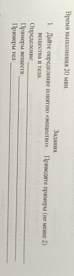 1. Дайте определение понятию «вещество». Приведите примеры (не менее 2) вещества и тела. Определение: Примеры веществ: Примеры тел: