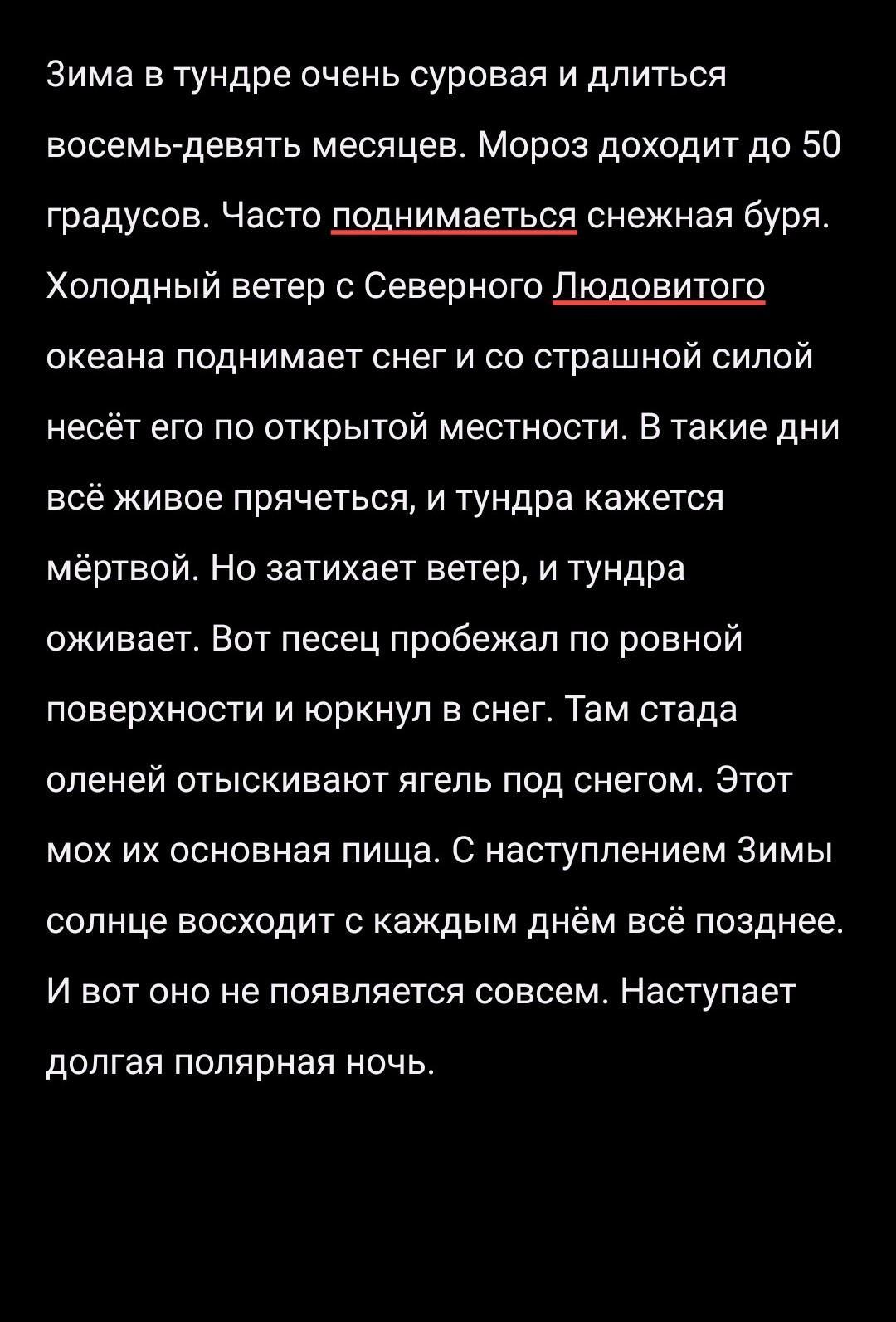 Тундра в зиму очень суровая и длится восемь-девять месяцев. Мороз достигает до 50 градусов. Часто поднимается снежная буря. Холодный ветер с Северного Ледовитого океана поднимает снег и со страшной силой сыпет его по открытой местности.