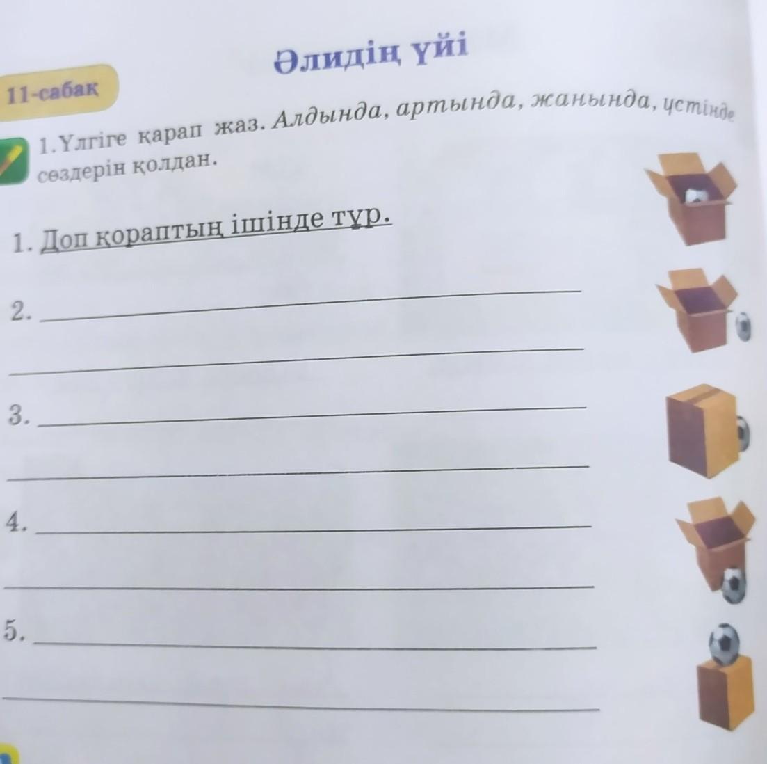 ң үйі 1. Үлгіге қарап жаз. Алдында, армында, жанында, устан сөздерін қолдан. 1. Доп қораптың ішінде тұр. 11-сабақ 2. 3. 4. 5.
