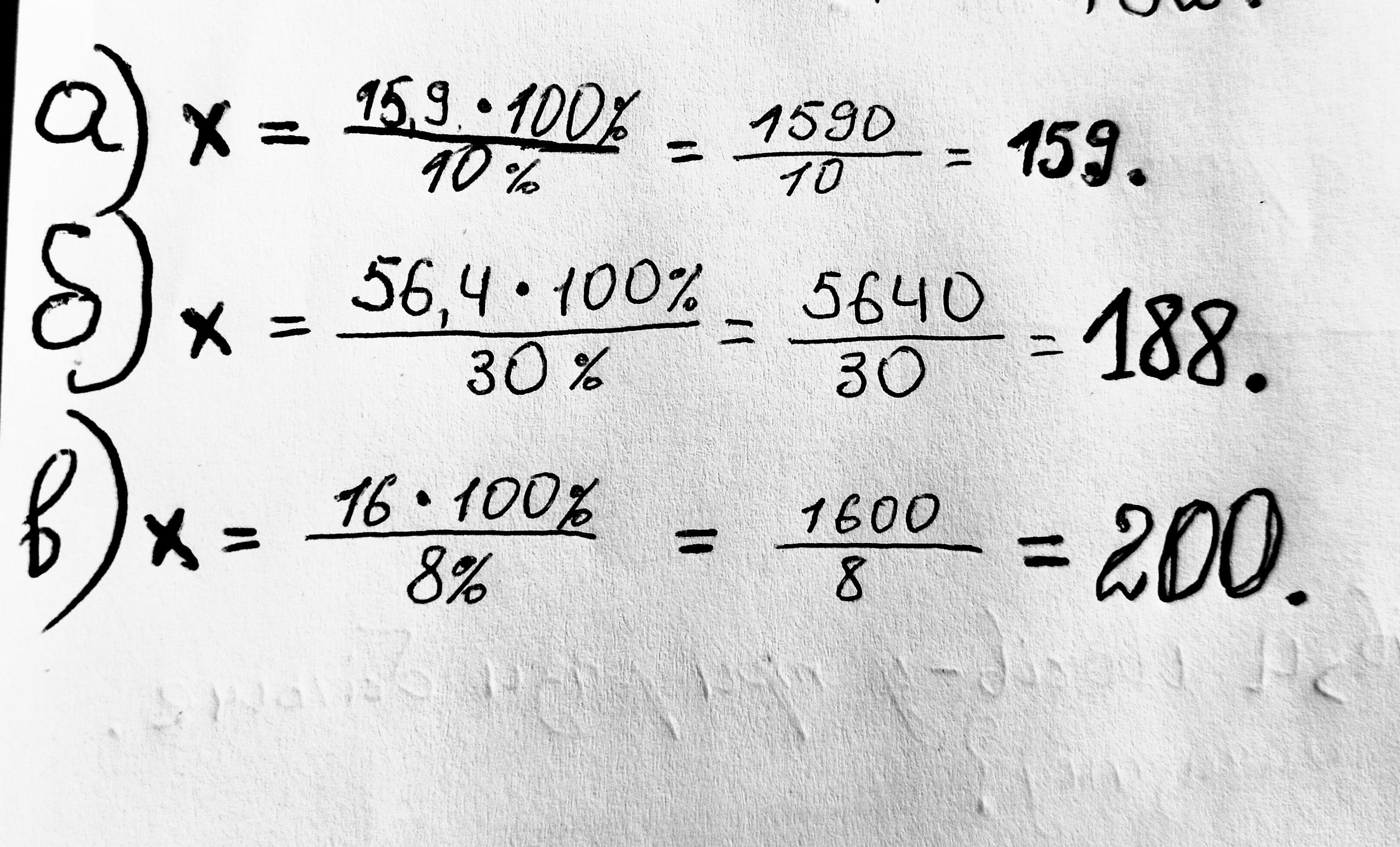 2. Знайди число: а) 10% якого дорівнюють 15,9; б) 30% якого дорівнюють 56,4; в) 8% якого дорівнюють 16. Срочно розписать дам 25 балов