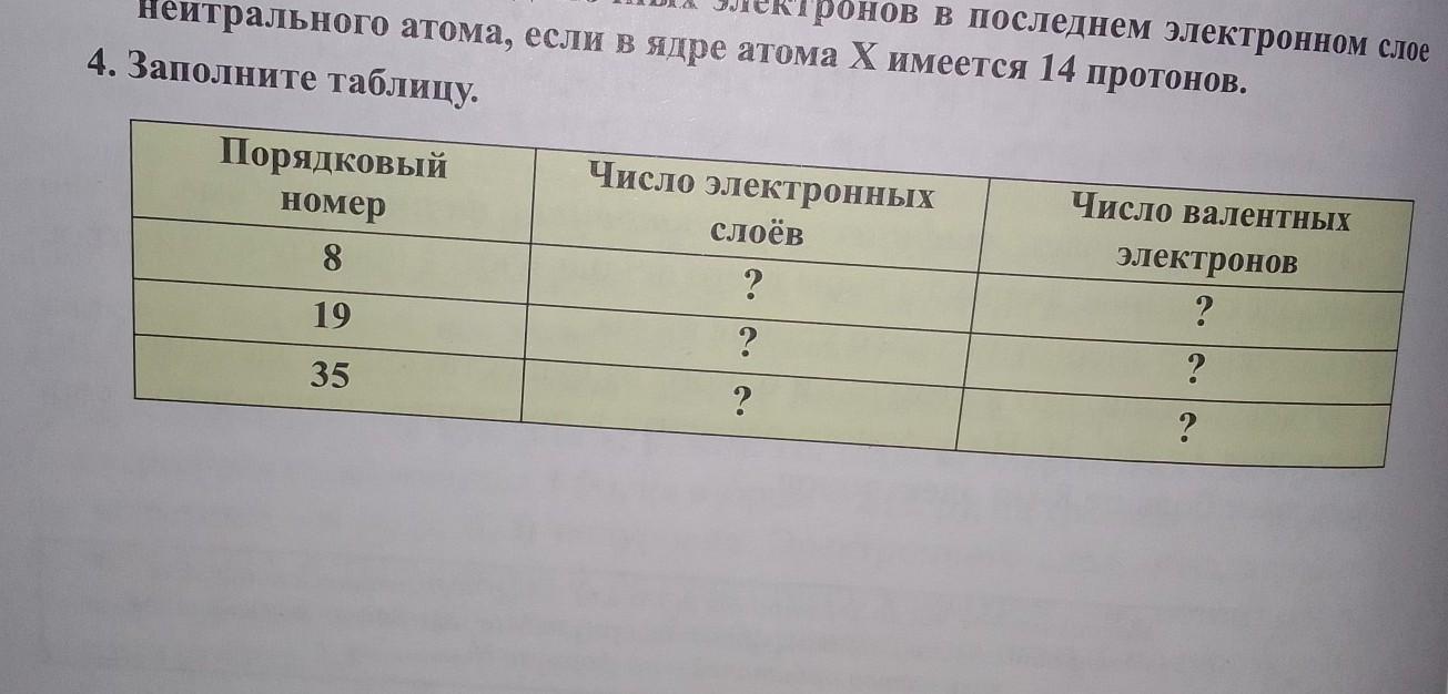 2.Порядковый номер 19 это Калий K у него 4 электронных слоя (т.к в 4 периоде) и у него 1 валентный электрон (т.к на последнем подуровне 1 электрон)