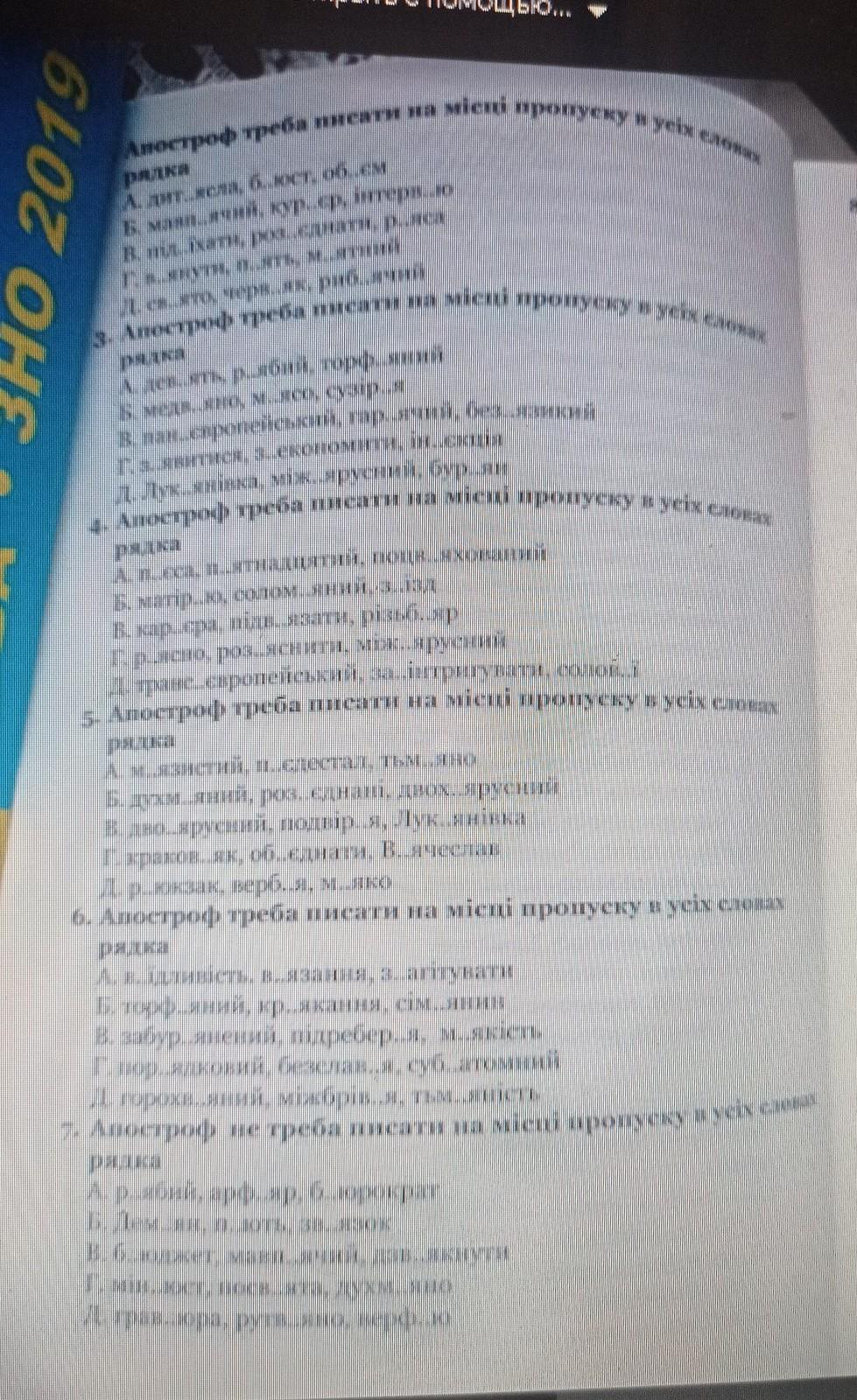 . Апостроф треба писати на місці пропуску в усіх словах рядка А. п.єса, пятнадцятий, поцв яхований Б. матір.ю, солом яний, В. карєра, підвязати, різьбяр Г. р., разяснити, між, ярусний Д. транссвропейський, заінтригувати, солой. 5. Апостроф треба писати на місці пропуску в усіх словах рядка Ай, п. сдестал, тьмяно Б. духмяний, роз, єднані, двох ярусний В двоярусний, подвір..я, Лук, як Г. краковяк, об єднати, В. Вячеслав Д. рюкзак, верб.я, м..яко Апостроф треба писати на місці пропуску в усіх словах . рядка 6 А. відливість, вязания, загувати Б. торфяний, кр.якання, сім, янин В. забур янений, підребер..в, м.якість 1. порядковий, безслав, я, суб, атомний Д. гороханий, міжбрів, я, тьмяність