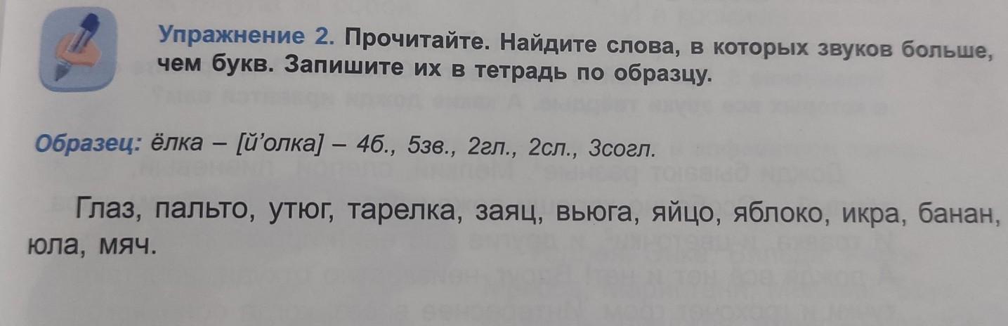Упражнение 2. Прочитайте. Найдите слова, в которых звуков больше, чем букв. Запишите их в тетрадь по образцу. - Образец: ёлка - [й'олка] — 4б., 5зв., 2гл., 2 с.л., 3согл. Глаз, пальто, утюг, тарелка, заяц, вьюга, яйцо, яблоко, икра, банан, юла, мяч.