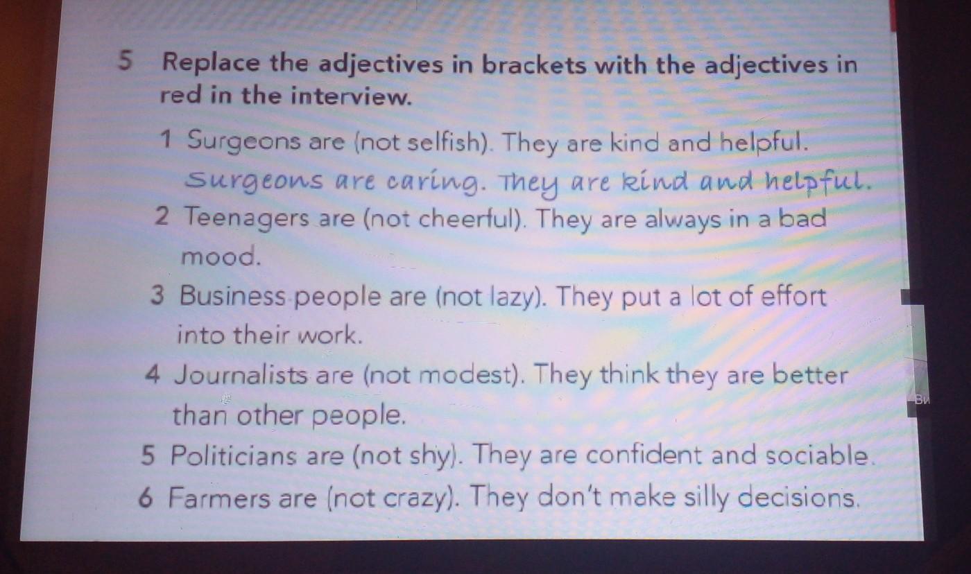 5 Replace the adjectives in brackets with the adjectives in red in the interview. 1 Surgeons are (not selfish). They are kind and helpful. Surgeons are caring. They are kind and helpful. 2 Teenagers are (not cheerful). They are always in a bad mood. 3 Business people are (not lazy). They put a lot of effort into their work. 4 Journalists are (not modest). They think they are better than other people. 5 Politicians are (not shy). They are confident and sociable. 6 Farmers are (not crazy). They don't make silly decisions.