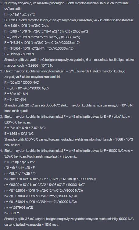 1. Zaryadi -4 nC bo'lgan nuqtaviy zaryadning 6 cm masofada hosil qilgan maydon kuchlanganligini toping. 2. Elektr maydon kuchlanganligi 3000 N/C boʻlgan nuqtada turgan zaryadi 20 nC boʻlgan sharchaga qanday kuch ta'sir qiladi? 3. Bir jinsli elektrostatik maydonda 5.10-8 C zaryadga 8 uN kuch ta'sir qilmoqda. Zaryad turgan nuqtadagi elektr maydon kuchlanganligini toping. 4. Zaryadi 3,6 nC boʻlgan nuqtaviy zaryaddan qanday masofada maydon kuchlanganligi 9000 N/C ga teng bo'ladi?