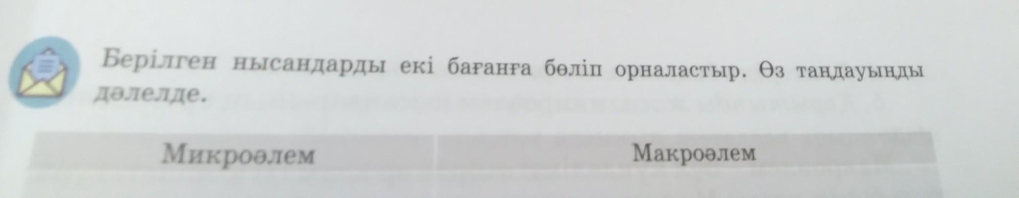 Берілген нысандарды екі бағанға бөліп орналастыр. Өз таңдауыңды дәлелде. Микроәлем Макроәлем.