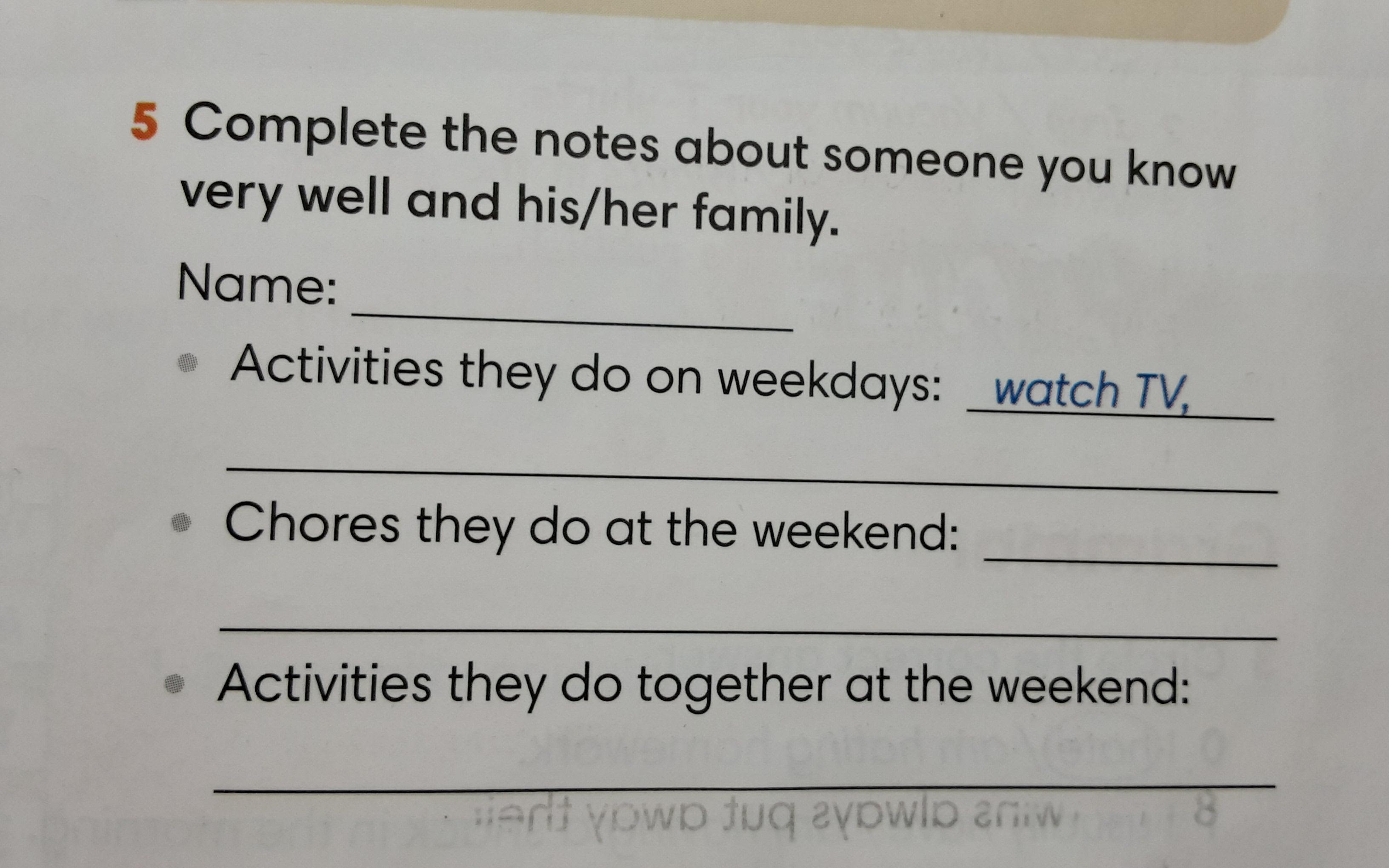 Activities they do ob weekdays:watch TV,walking together in the evening,preparing dinner.