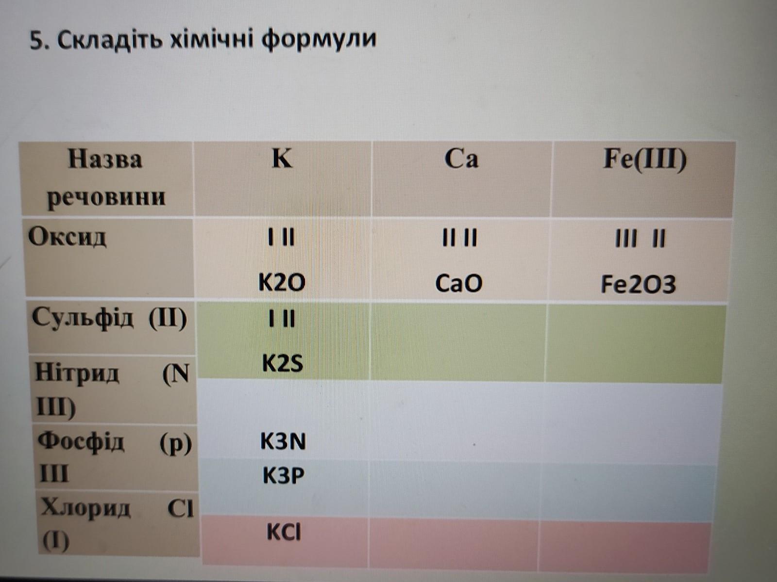 5. Складіть хiмiчнi формули Назва речовини Оксид Сульфід (II) Нітрид (N III) K Хлорид CI (1) | || К20 | || K2S Фосфід (р) K3N III КЗР KCI Ca |||| CaO Fe(III) ||| || Fe2O3