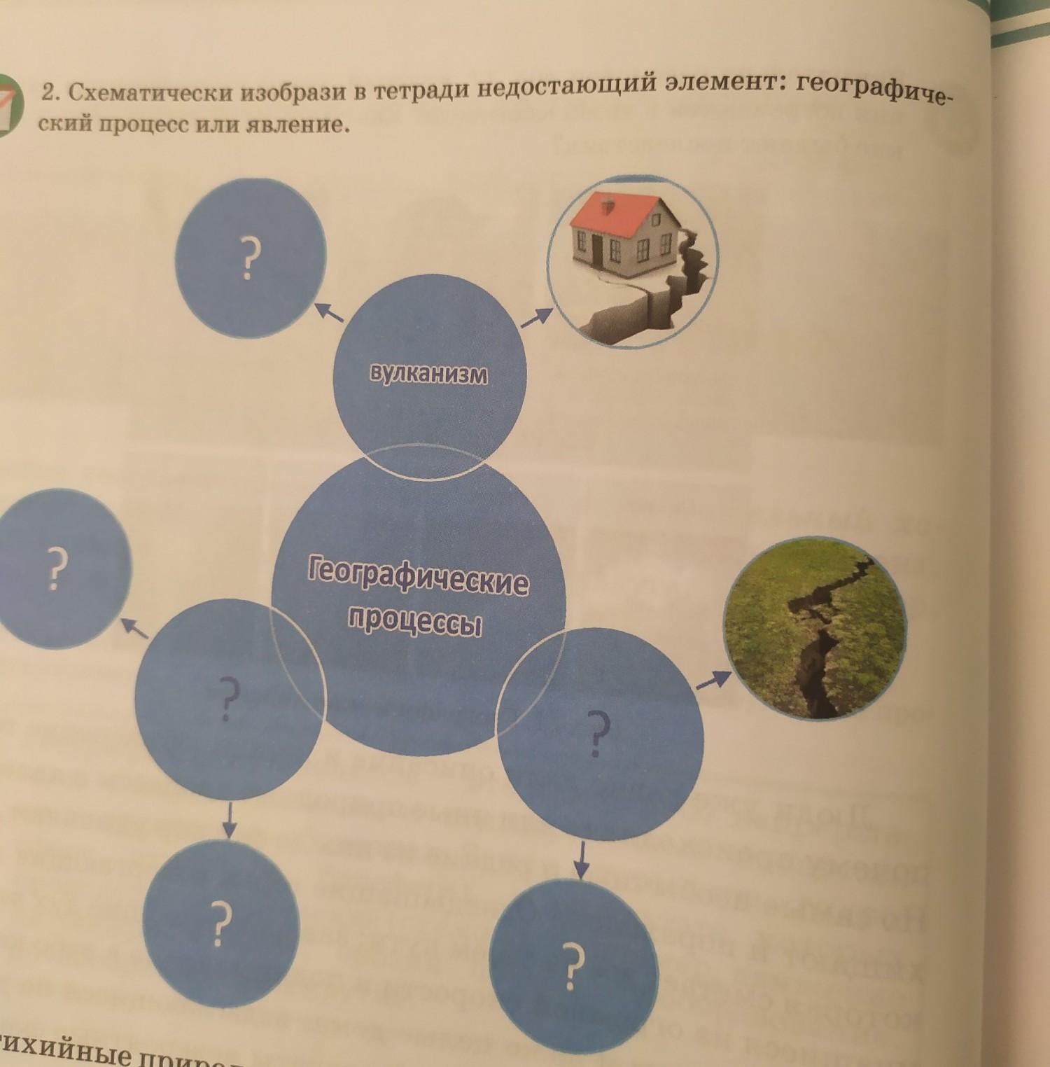 2. Схематически изобрази в тетради недостающий элемент: географиче ский процесс или явление. ? ? вулканизм Географические процессы