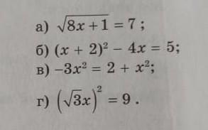Решите уравнения a) √8x + 1 = 7; 6) (x + 2)² - 4x = 5; B) -3x²= 2 + x²; r) (√3x)² = 9.
