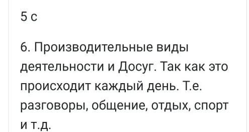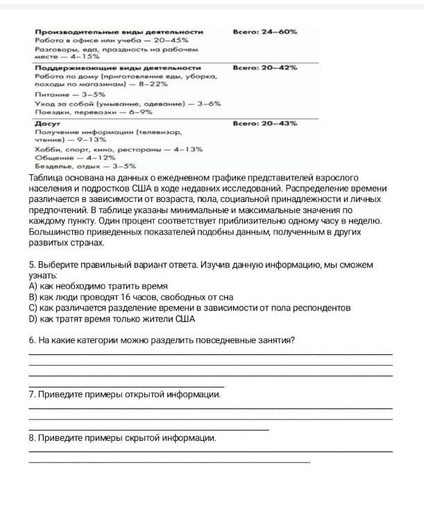 Производительные виды деятельности Робота в офисе или учеба - 20-45% Разговоры, еда, проздность на рабочем место -4-15% Поддерживающие виды деятельности Робота по домутление еды, уборка, походы по магазинам - 8-22% Питание - 3-5% Уход за собой (умывание, одевание) - 3-6% Поездки, перевозки - 6-9% Досуг Получение информации (телевизор. чтение) — 9-13% Хобби, спорт, кино, рестораны - 4-13% Общение - 4-12% Бездель, отдых - 3-5% Всего: 24-60% 7. Приведите примеры открытой информации. Всего: 20-42% Таблица основана на данных о ежедневном графике представителей взрослого населения и подростков США в ходе недавних исследований. Распределение времени различается в зависимости от возраста, пола, социальной принадлежности и личных предпочтений. В таблице указаны минимальные и максимальные значения по каждому пункту. Один процент соответствует приблизительно одному часу в неделю. Большинство приведенных показателей подобны данным, полученным в других развитых странах. 8. Приведите примеры скрытой информации. Bcero: 20-43% 5. Выберите правильный вариант ответа. Изучив данную информацию, мы сможем узнать: А) как необходимо тратить время В) как люди проводят 16 часов, свободных от сна С) как различается разделение времени в зависимости от пола респондентов D) как тратят время только жители США 6. На какие категории можно разделить повседневные занятия?