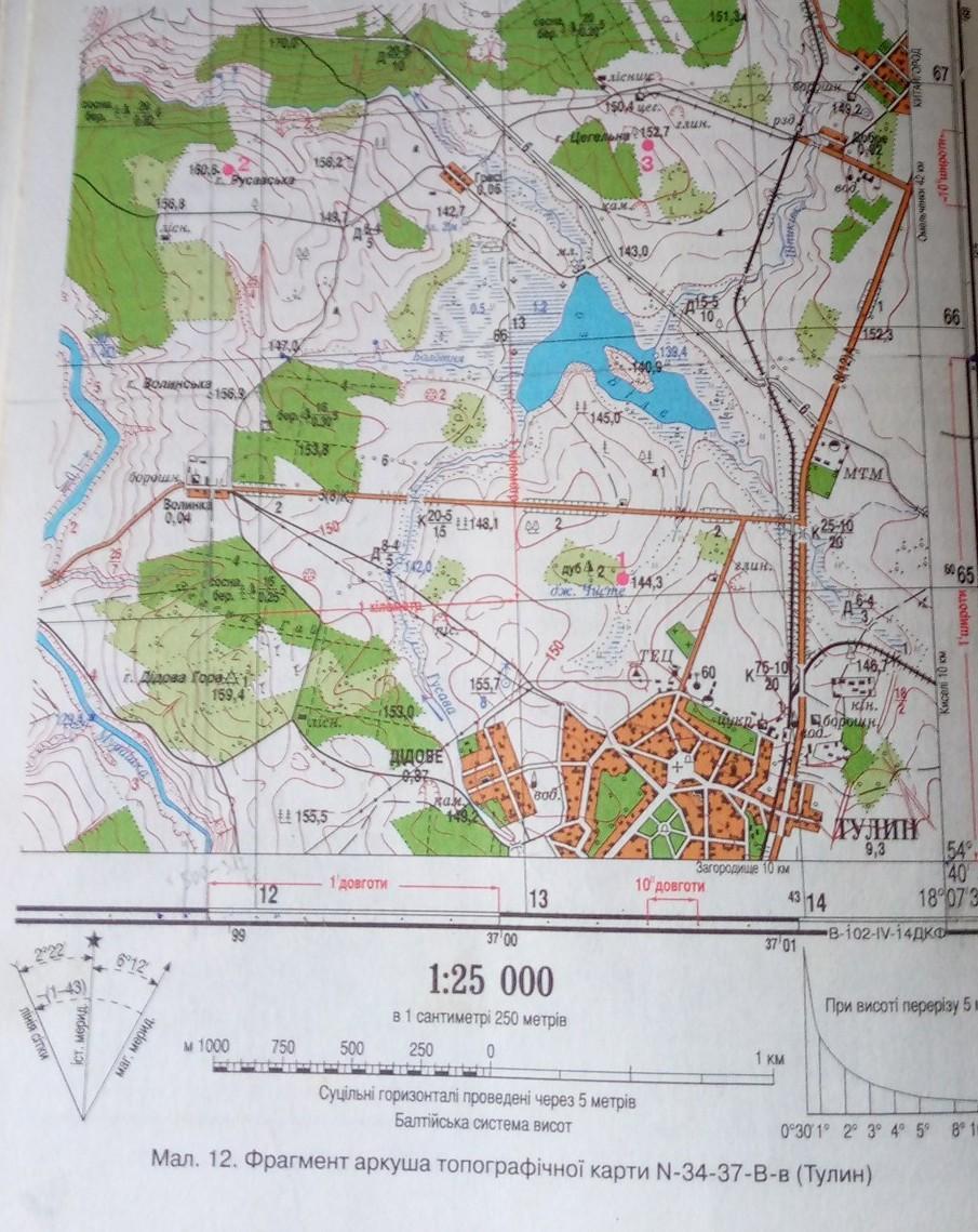 визначте за фрагментом топографічної карти (див.мал 12) географічні та прямокутні координати точок і запишіть їх у таблицю ДОПОМОЖІТЬ!!