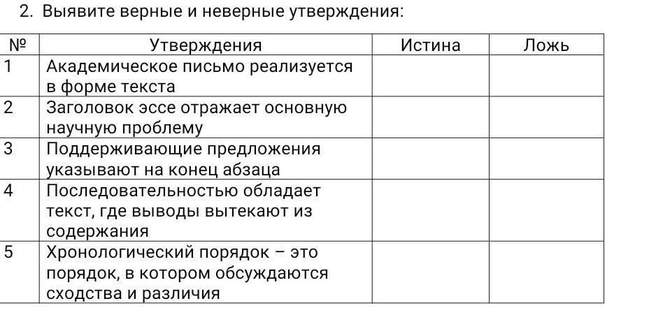 2. Выявите верные и неверные утверждения: Nº Утверждения 1 Академическое письмо реализуется 2 3 4 в форме текста Заголовок эссе отражает основную научную проблему Поддерживающие предложения указывают на конец абзаца Последовательностью обладает текст, где выводы вытекают из содержания 5 Хронологический порядок — это порядок, в котором обсуждаются различия Истина Ложь