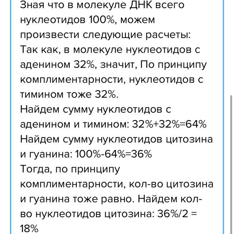 Так как, в молекуле нуклеотидов с аденином 32%, значит, По принципу комплиментарности, нуклеотидов с тимином тоже 32%.