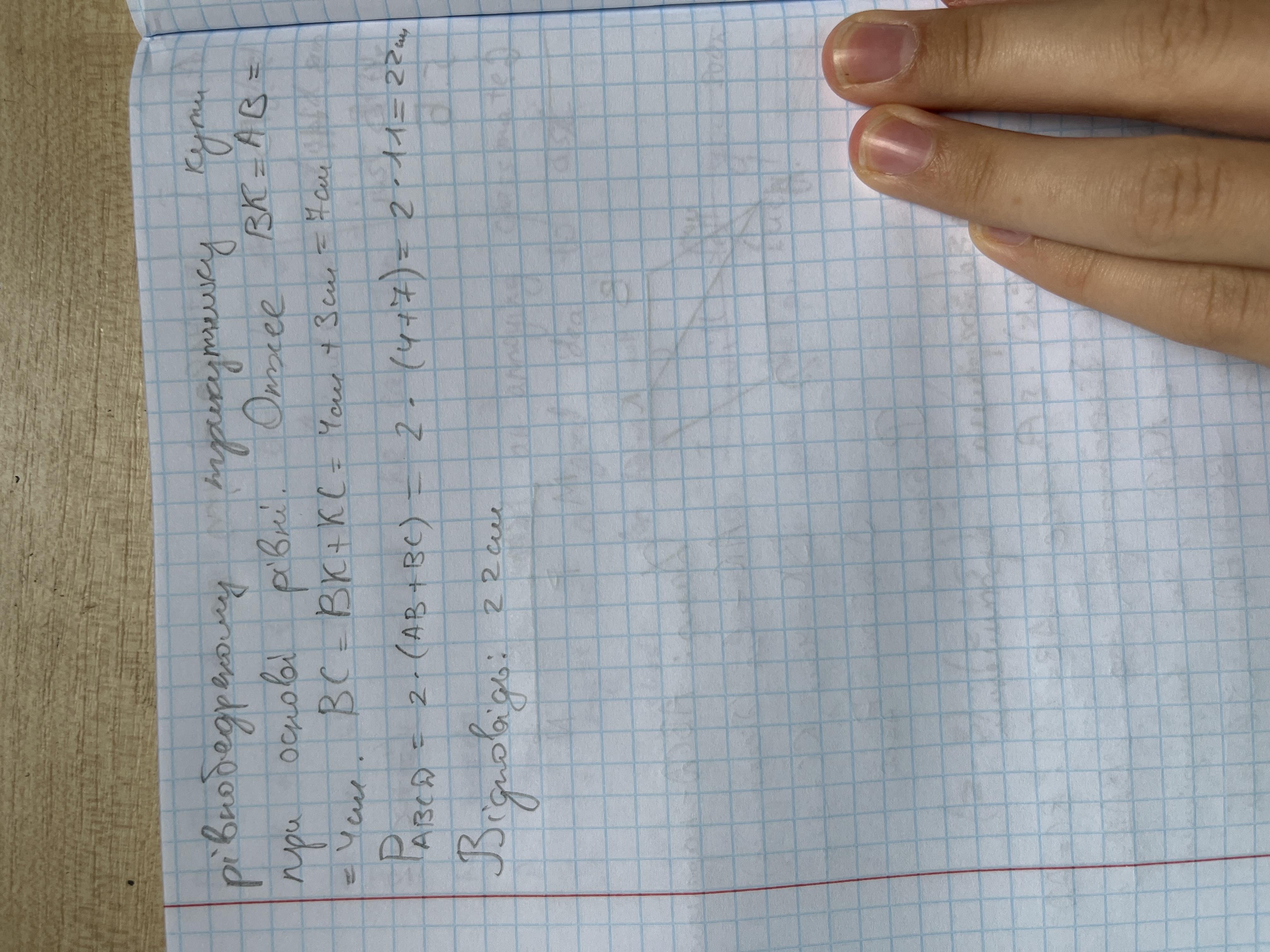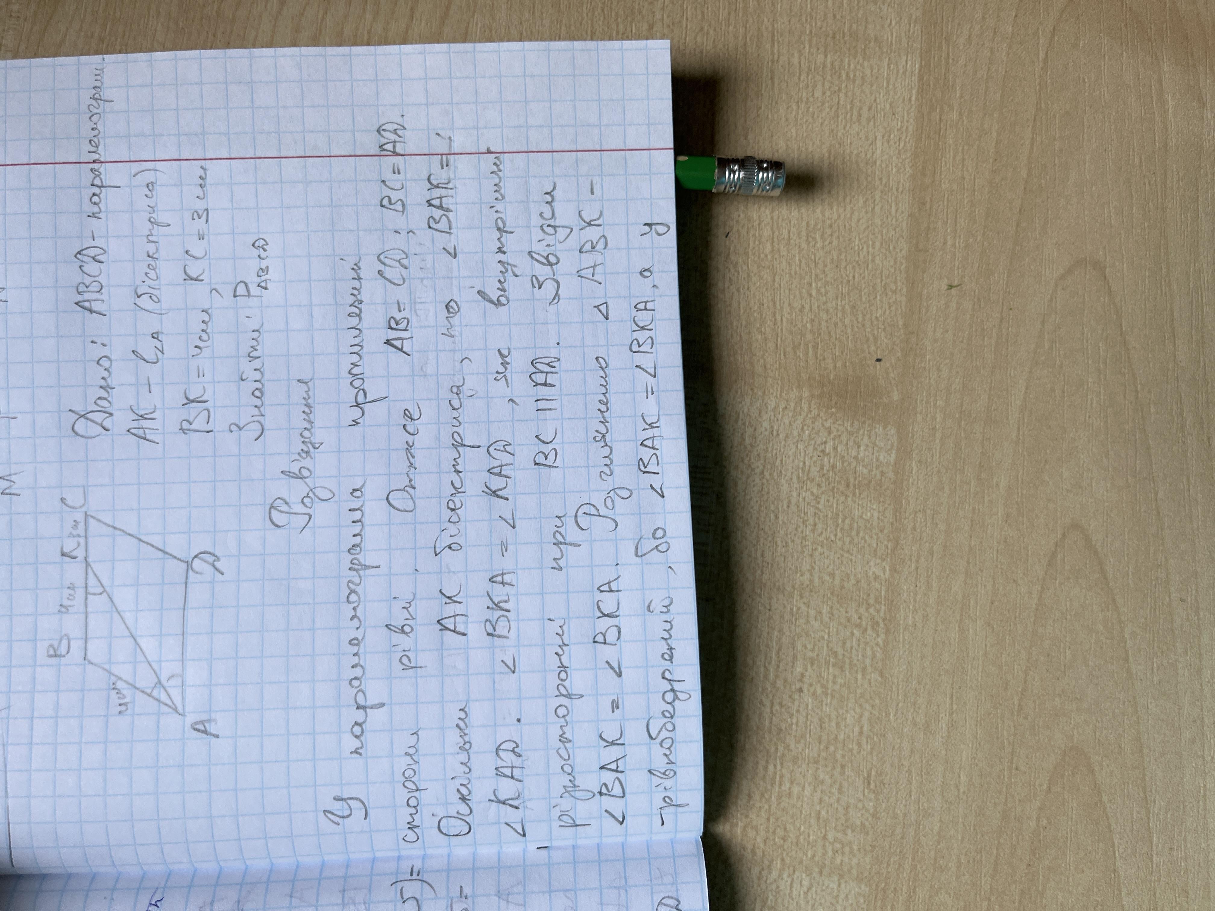 у парелелограмі АВСD бісектриса кута А поділяє сторону ВС на відрізки ВК=4см і КС=3см. знайдіть периметр паралелограми