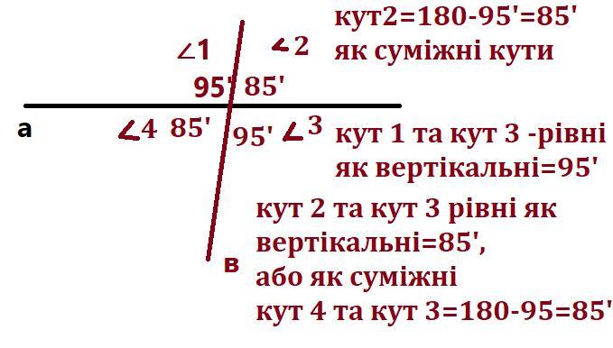 Один з кутів, утворений при перетені двох прямих , дорівнюе 95°. Знайдіть інших три кути.