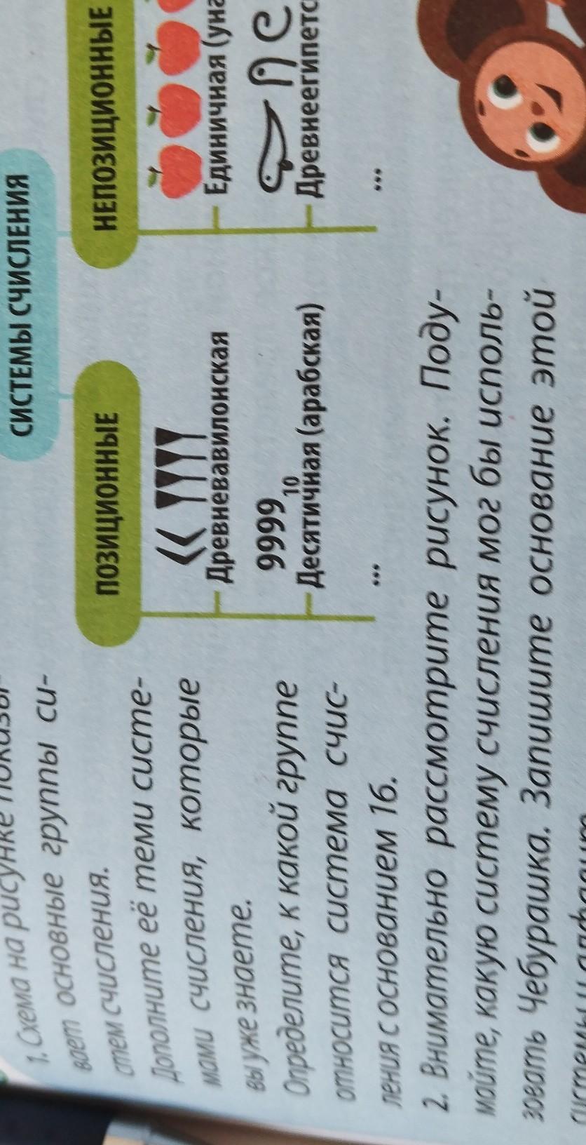 2. внимательно рассмотрите рисунок. Подумайте,какую систему счисления мог бы использовать Чебурашка. Запишите основание этой системы и алфавит.