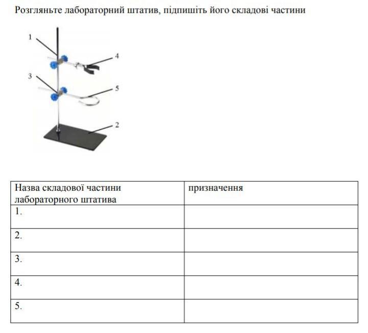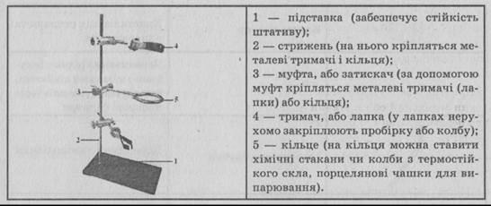 До стержня лабораторного штатива за допомогою муфт (3) кріпляться металеві тримачі (їх ще називають лапками) (4) або кільця (5). У лапках нерухомо закріплюють пробірку або колбу. На кільця можна ставити хімічні стакани чи колби з термостійкого скла, чашки для випарювання.