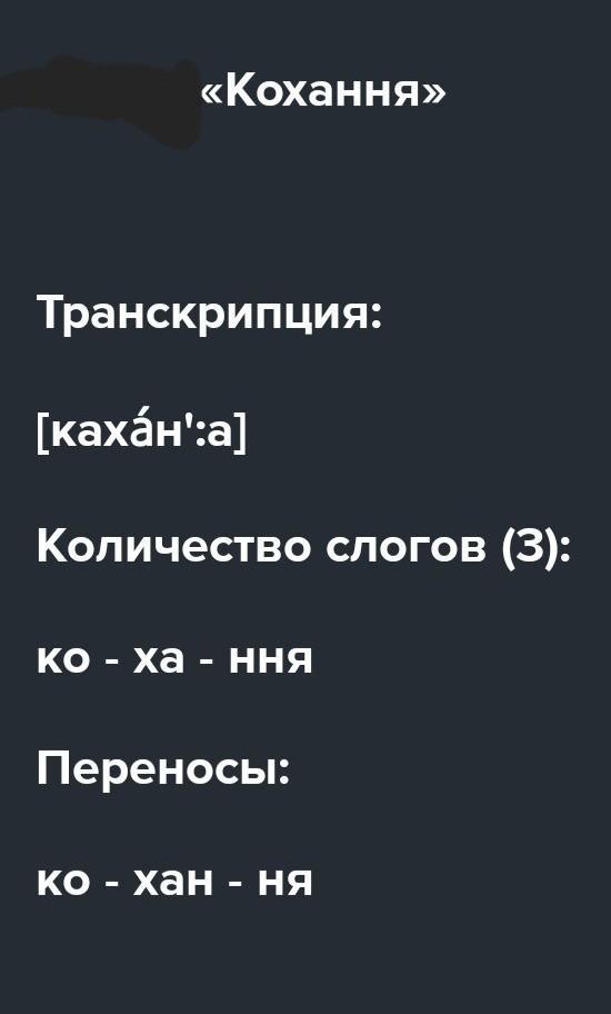 Ко-ха-ння - [к о х а́ н': а] - 3 склади, 7 букв, 6 звуків.