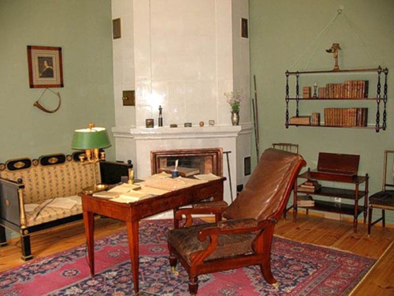 Обстановка кабинета воспроизведена такой же, какой она была при жизни поэта в Михайловской ссылке. В центре небольшой комнаты стоит письменный стол. На нем – стопка книг, листы, исписанные стремительным почерком поэта. Рядом с подсвечником на четыре рожка - ножницы для снимания нагара со свечей, в металлическом стакане- гусиные перья, рядом с чернильницей – песочница. Между окнами – наполненный книгами шкаф, на противоположной стене висит полочка, тоже заставленная книгами. Напротив письменного стола, у стены, стоит диван, у противоположной стены – деревянная кровать с пологом. Неподалеку от дивана, в углу, туалетный столик, в другом углу, у камина, на полу – огромные трубки с чубуками для курения. На полу – большой, почти во всю комнату ковер.