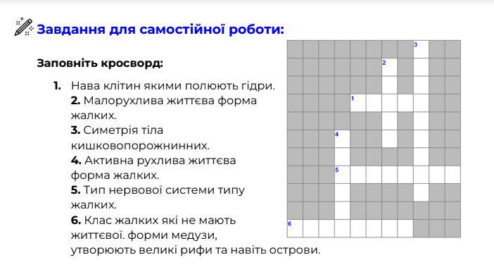 1. Жалкі 2. Поліп 3.Радіальна 4. Медуза 5.Дивузною 6. Коралові