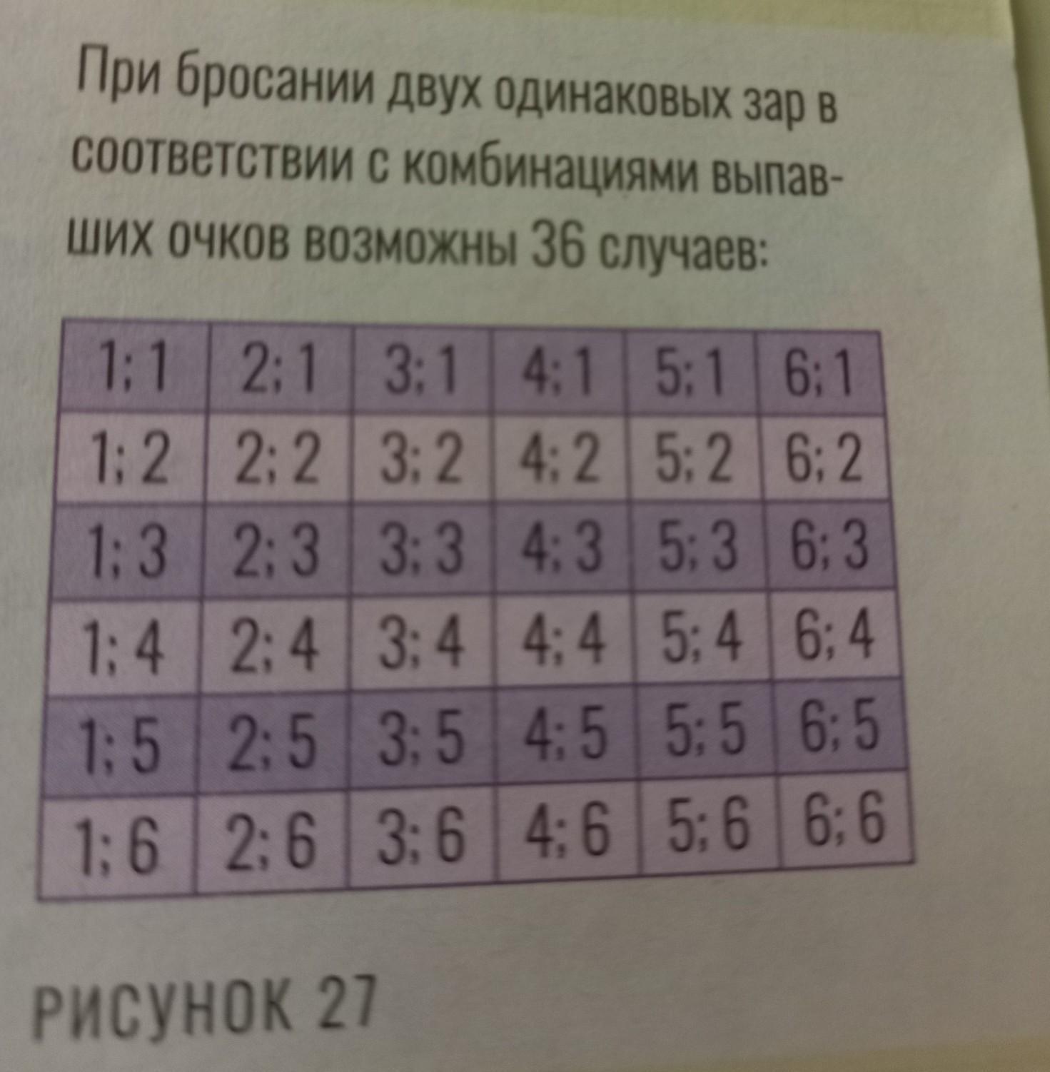 Найдите вероятности следующих событий при одновре- менном бросании двух зар (рисунок 27): а) сумма выпавших очков будет равна 6; b) модуль разности выпавших очков будет равен 2; с) выпадет одинаковое число на каждой заре. Результаты вычислений округлите до десятых.
